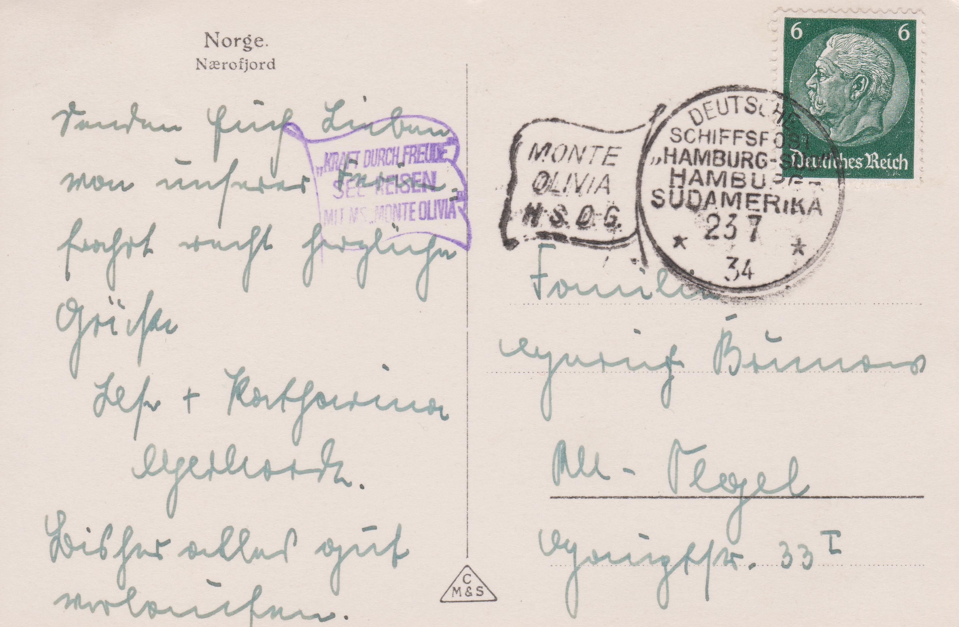 Für das Jahr 1934 belegt übernahm die Monte Olivia KdF-Reisen nach Norwegen und in der Ostsee. Hier eine Ansichtskarte aus Norwegen, die an Bord der MS MONTE OLIVIA aufgegeben wurde: