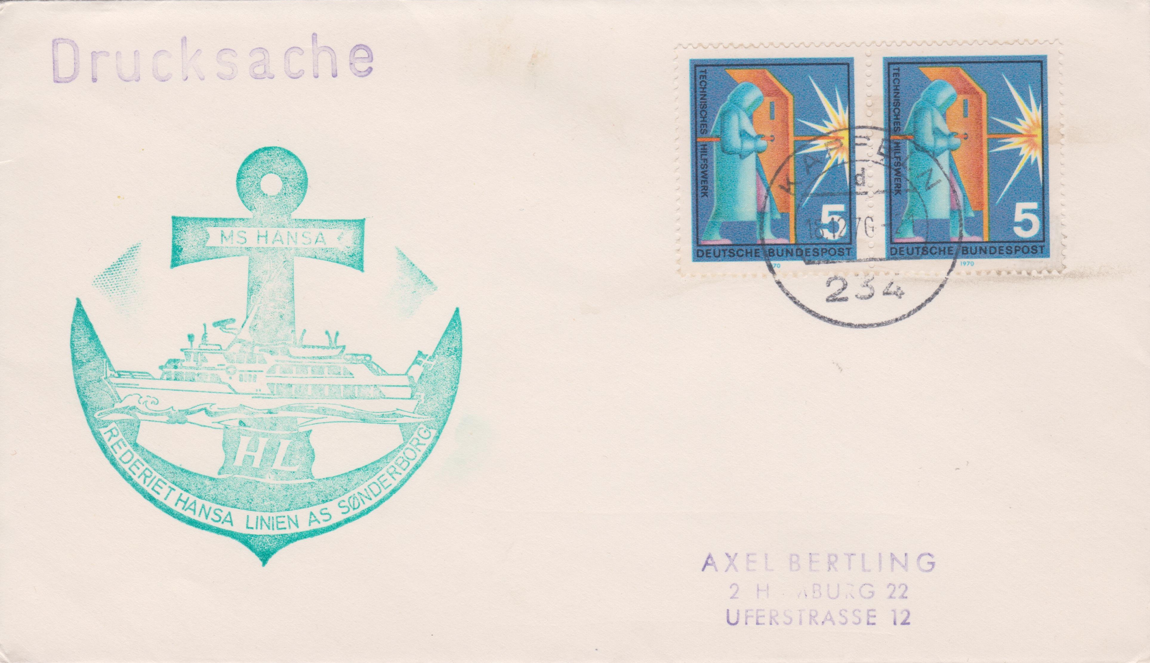 Drucksache mit Bordstempel der MS HANSA von der REDERIET HANSA LINIE AS SØNDERBORG vom 18.12.1970 aus KAPPELN: