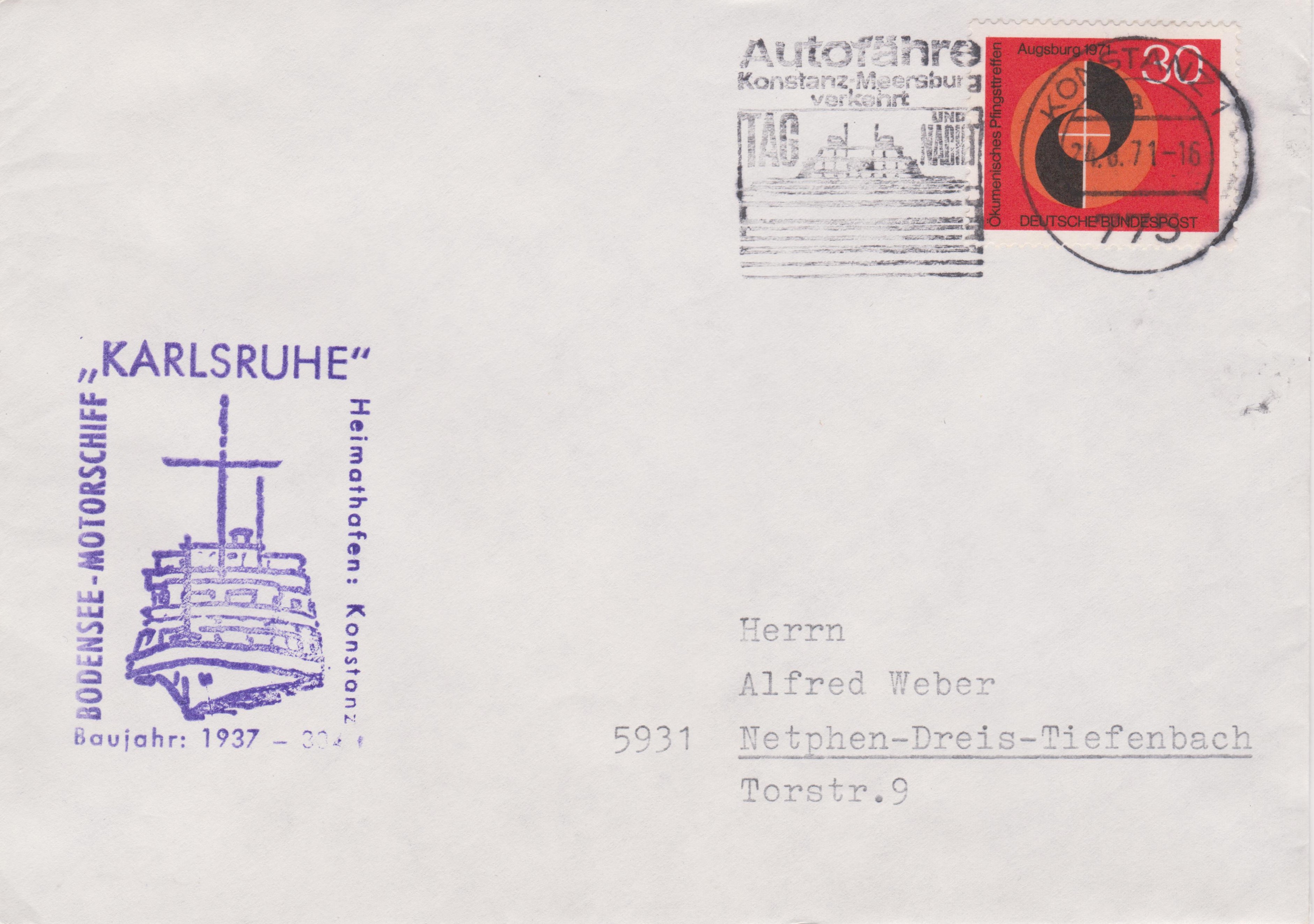 Am Heimathafen KOSTANZ wurde dieder Brief der Post zur weiteren Beföderung übergeben und die Frankatur wurde entwertet per Maschinenstempel mit Werbeeinsatz Autofähre Konstanz-Meersburg verkehrt TAG und NACHT.