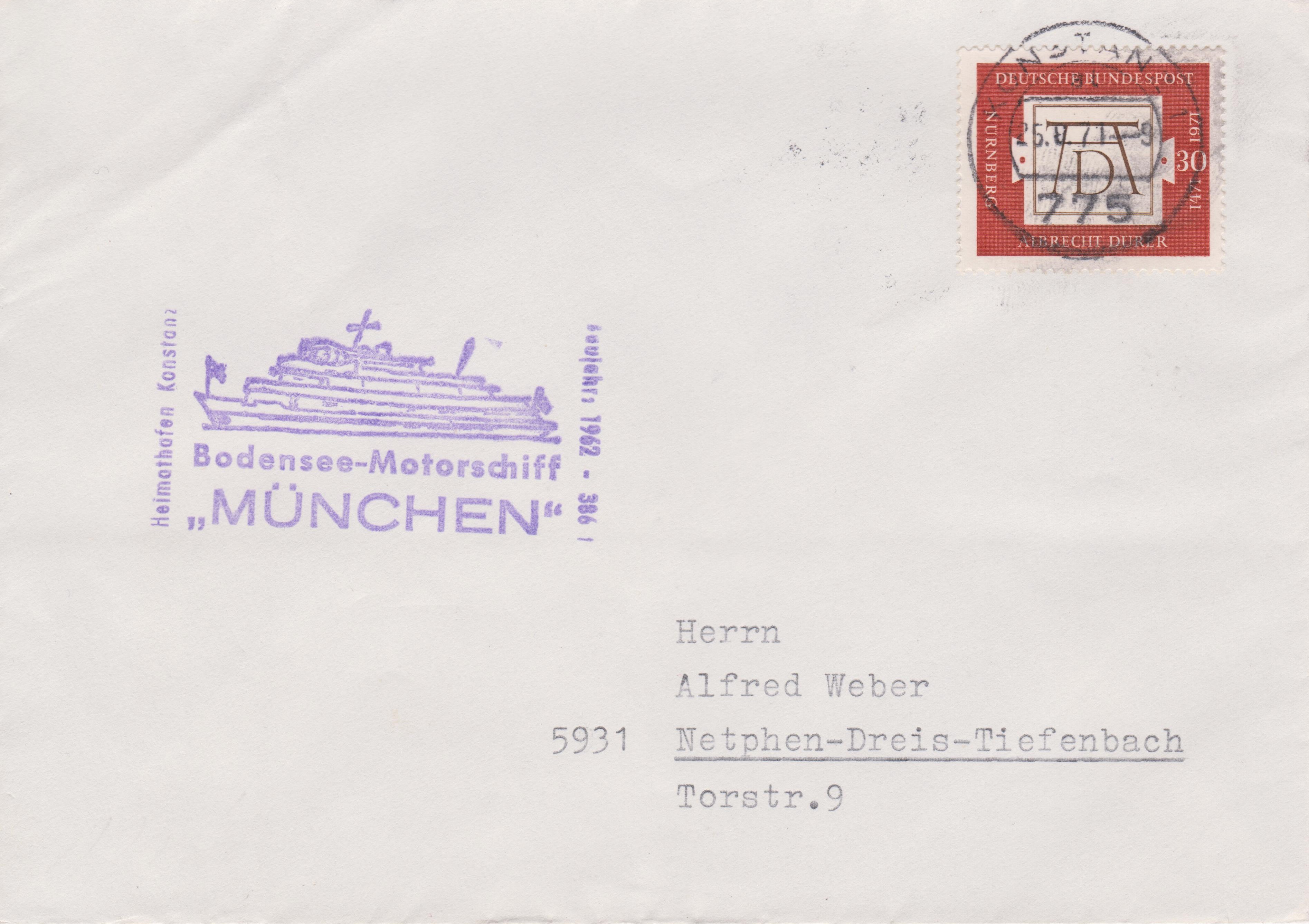Dieser nach 5931 Netphen-Dreis-Tiefenbach adressierte Brief wurde an Bord des Bodensee-Motorschiffs MÜNCHEN vaufgegeben und erhielt einen Cachetstempel des Schiffes: