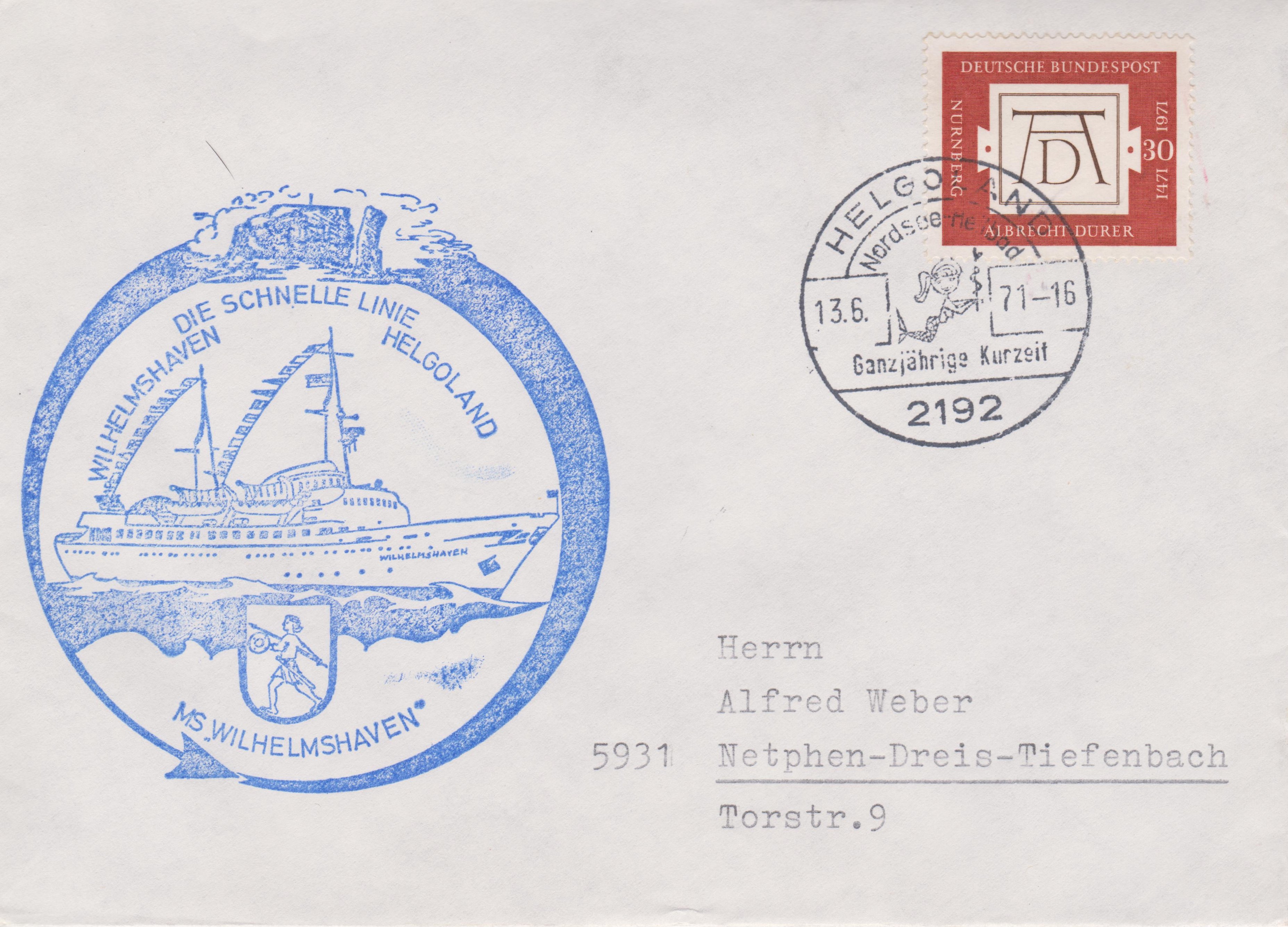 Dieser Beleg zeigt den Cachetsempel der MS WILHELMSHAVEN und wurde am 13.06.1971 auf HELGOLAND der Post zur weiteren Beförderung überrgeben und die Frankatur wurde per Handwerbestempel entwertet.