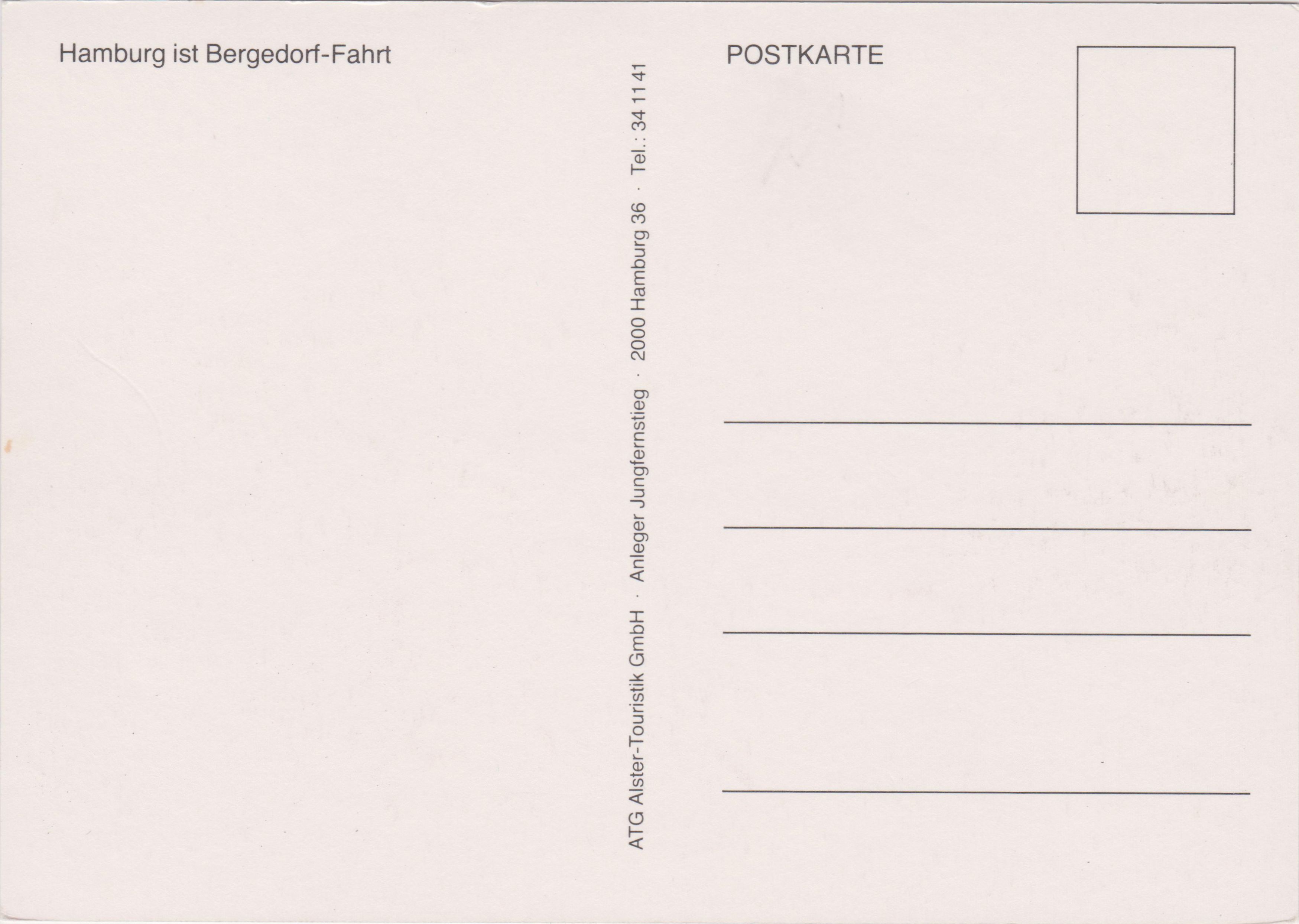 Hier eine ungebrauchte Ansichtskarte zum Thema "Hamburg ist Bergedorf-Fahrt" von der am "Anleger Jungfernstieg" ansässigen "ATG Alster-Touristik GmbH", die das Fahrgastschiff "Fleetenkieker", das diese Fahrten durchführte, vor der Reitbrooker Mühle im Hamburger Stadtteil Reitbrook im Bezirk Bergedorf zeigt: