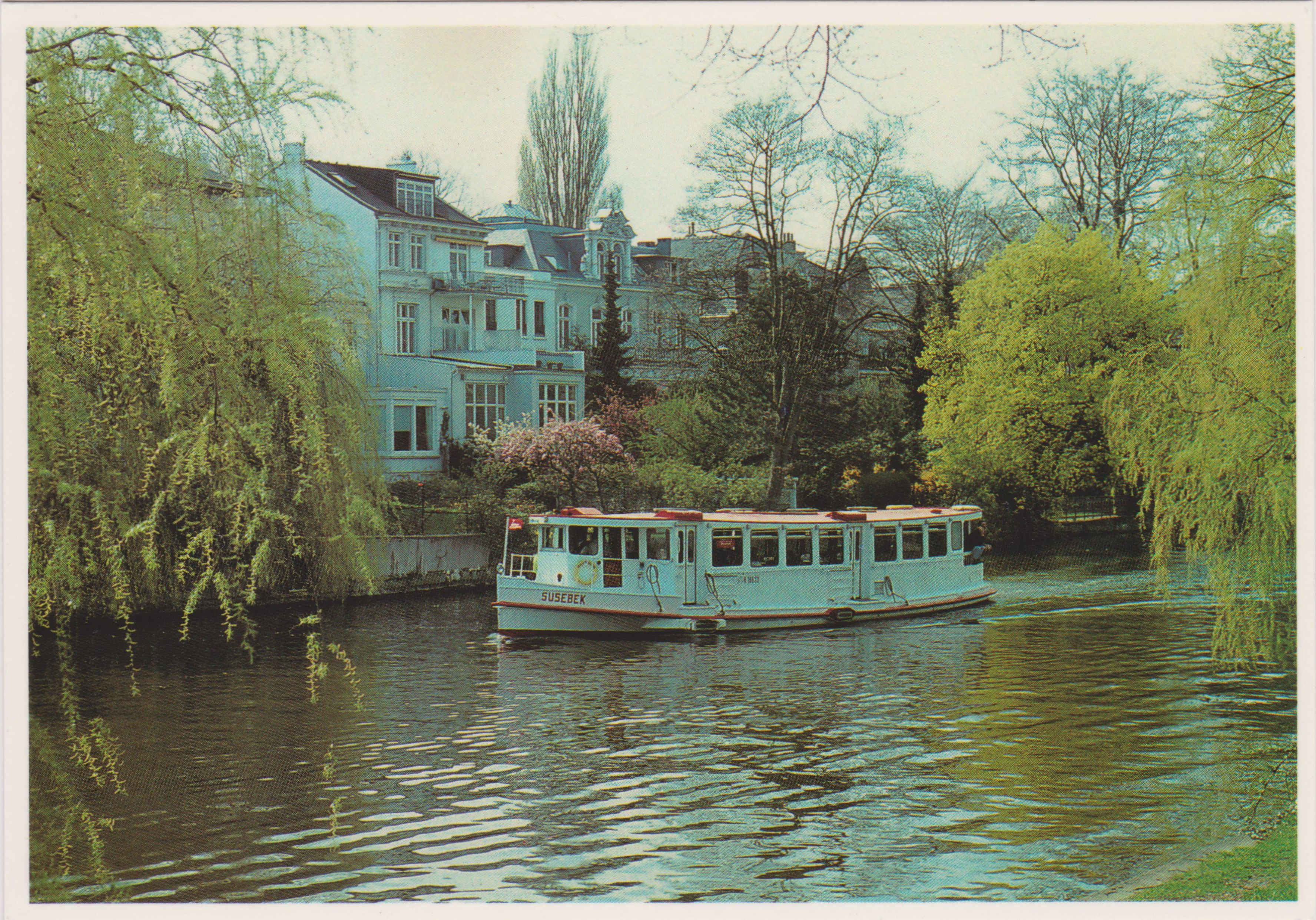 Diese Künstler-Ansichtskarte von René Menges zeigt die SUSEBEK beim "Alster-Schippern":