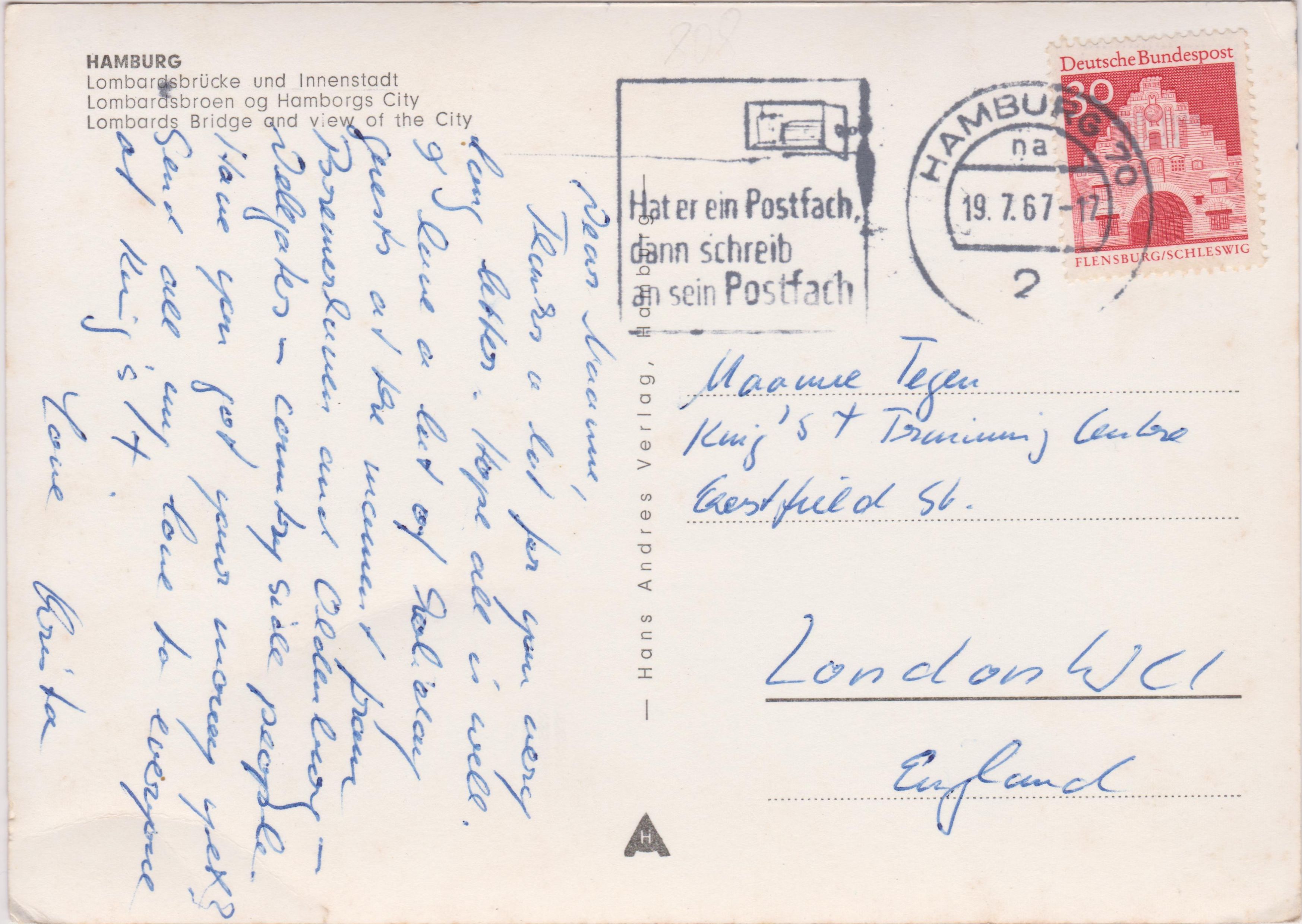 Diese Ansichtskarte "Nr. 410. Wilhelm Flohe Hamburg 3", betitelt "Dampferanlegesteg Lombardsbrücke", die ein Alsterschiff kurz vor dem Anlegen zeigt, wurde am 22.08.1930 in "Hamburg" beschrieben und am 23.08.1930 in Altona aufgegeben: