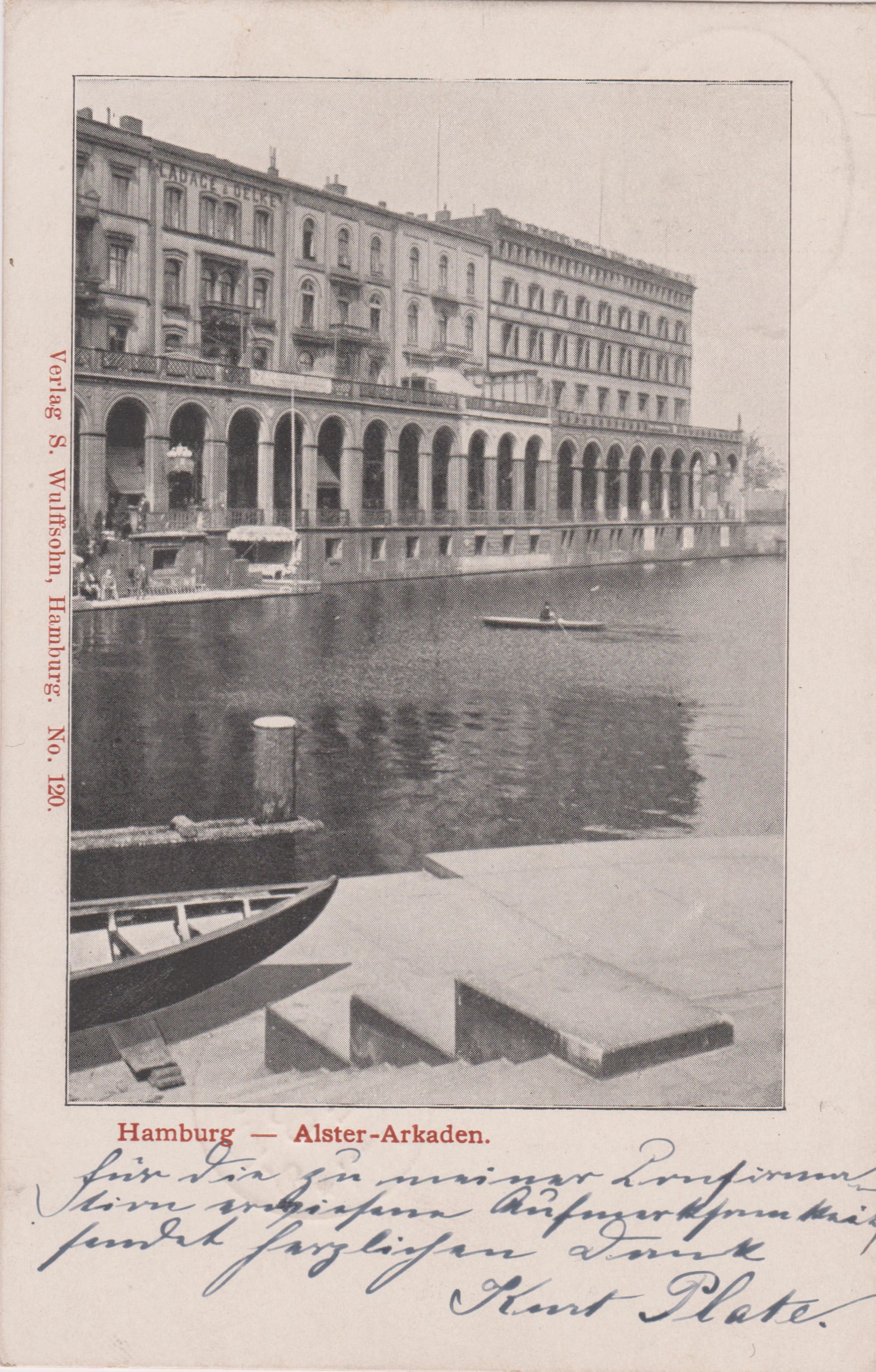 Diese Ansichtskarte "Verlag S. Wulffsohn, Hamburg. No. 120." ist betitelt "Hamburg - Alster-Arkaden." und zeigt einen Ruderer auf der "Kleinen Alster":