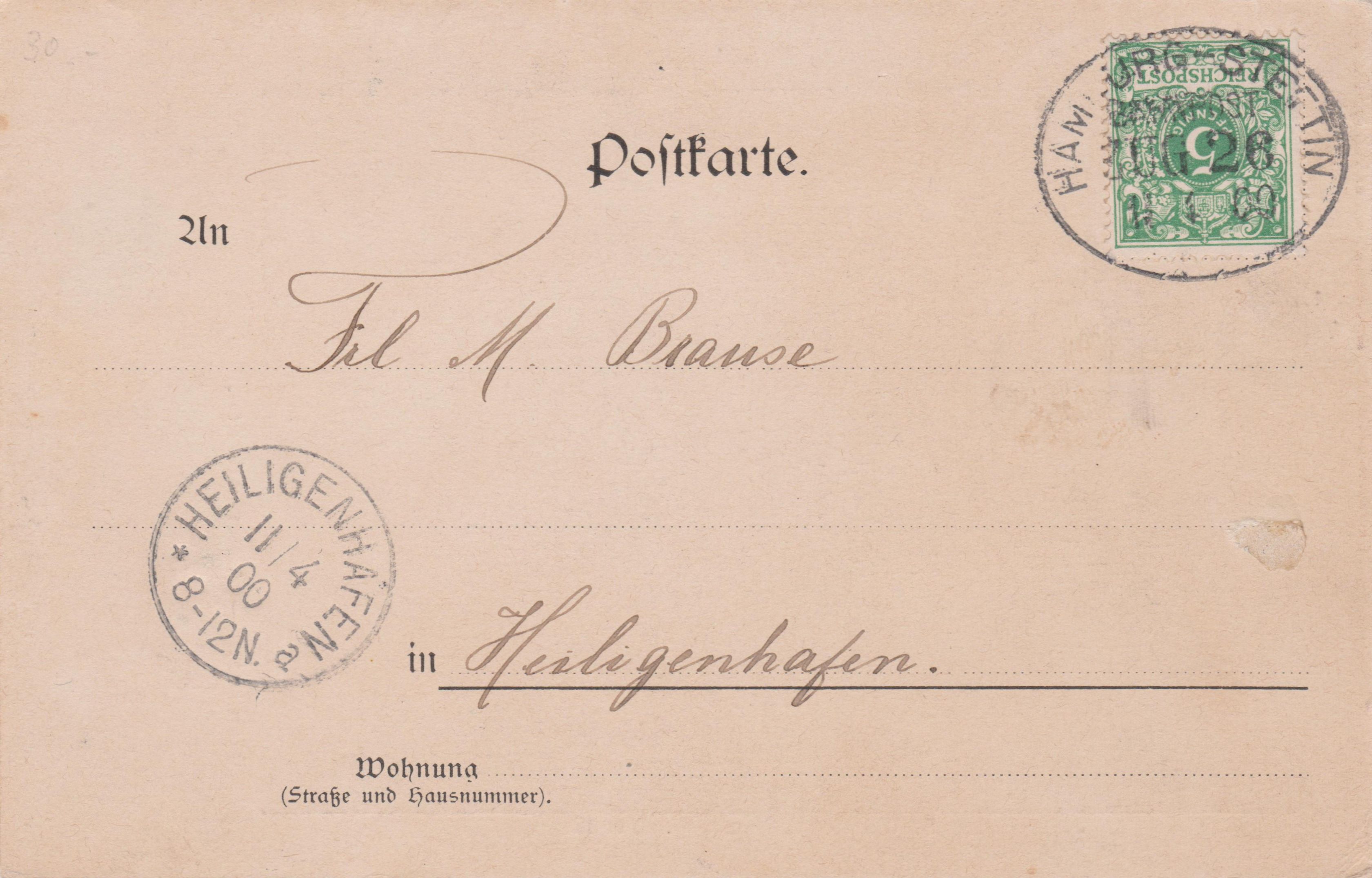 Diese Ansichtskarte wurde im April 1900 im "ZUG 26 HAMBURG-STETTIN" per Bahnpost aufgegeben und erhielt den für solche Sendungen üblichen Ovalstempel. Laut Kreisstempel "HEILIGENHAFEN" kam sie dort am 11.04.1900 abends = "8-12 N." (= 20-24 Uhr) an: