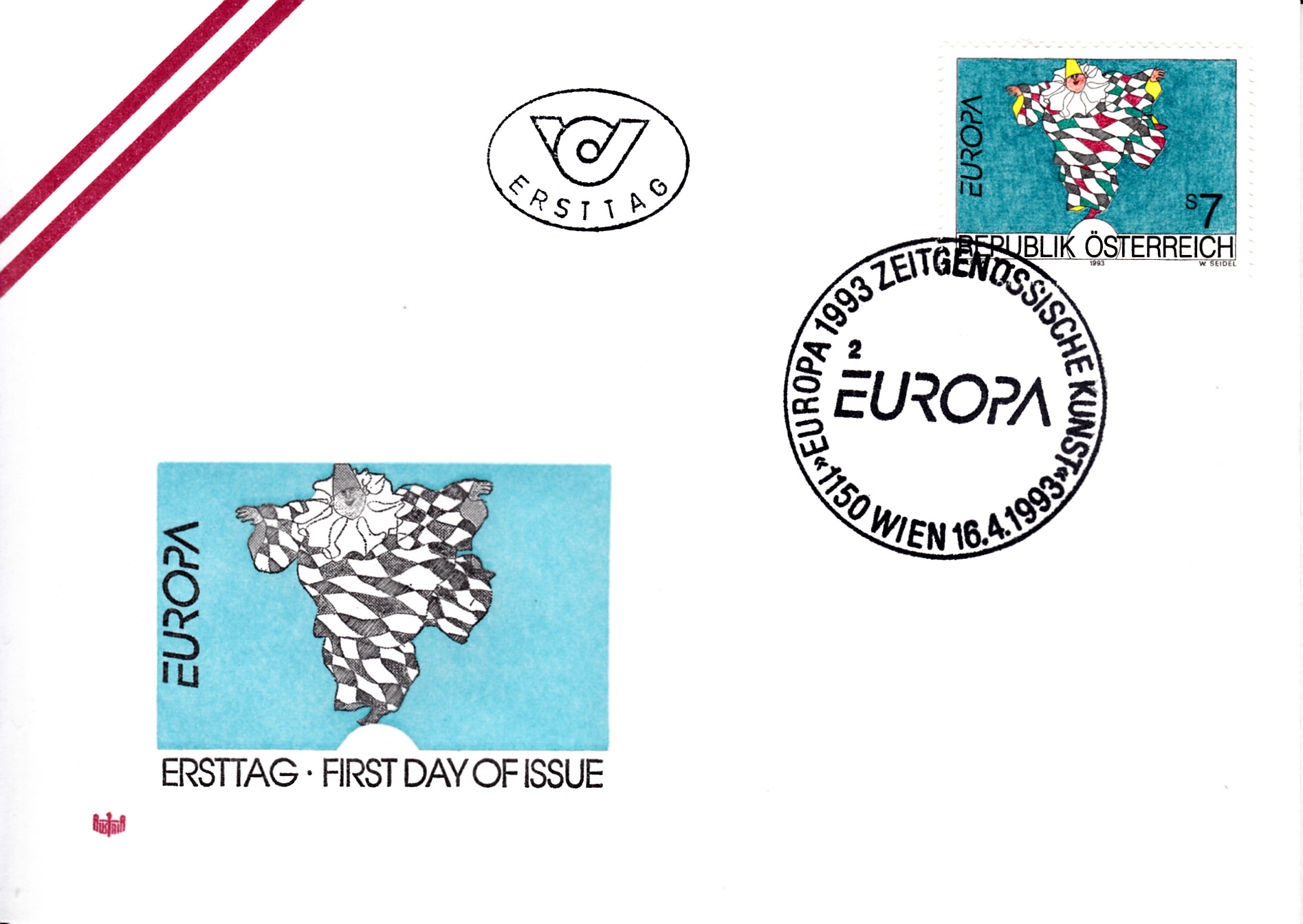 Die Europamarke 1993 zum Gemeinschaftsthema "Zeitgenössische Kunst" ist in Österreich am 16. April 1993 erschienen. Hier die Marke zu 7 Schilling mit der Abbildung des Werkes "Fliegender Harlekin" nach einer Zeichnung von Paul Flora (1922-2009). Die Auflage betrug 3 250 000 Stück.