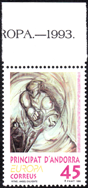 Die Europamarken 1993 der spanischen Post in Andorra zum Gemeinschaftsthema "Zeitgenössische Kunst" sind am 20. Mai 1993 erschienen. Hier die Marke zu 45 Pesetas mit der Abbildung des Gemäldes "Ritme" von Angel Calvente. Die Auflage der Marke betrug 650 000 Stück.