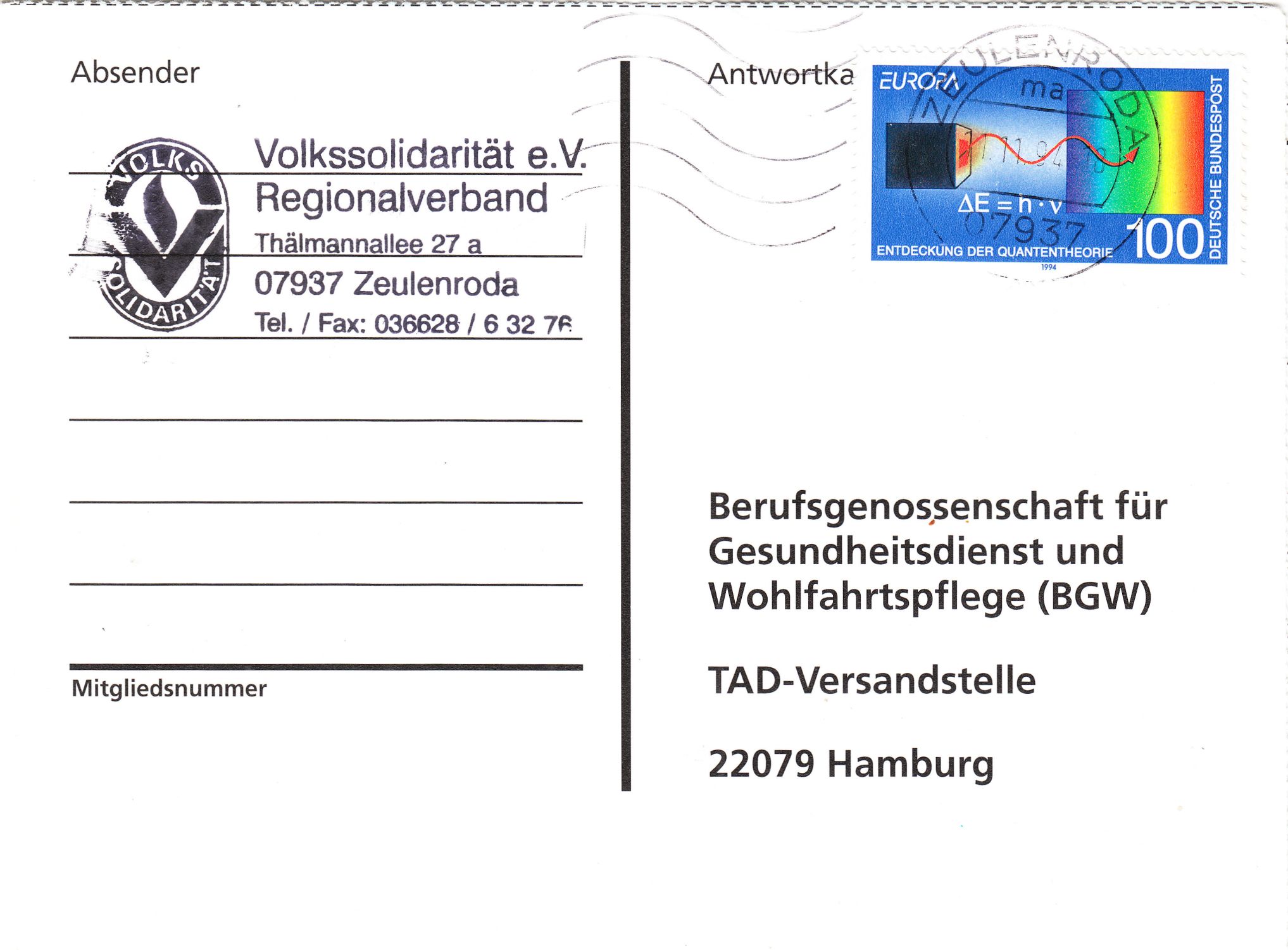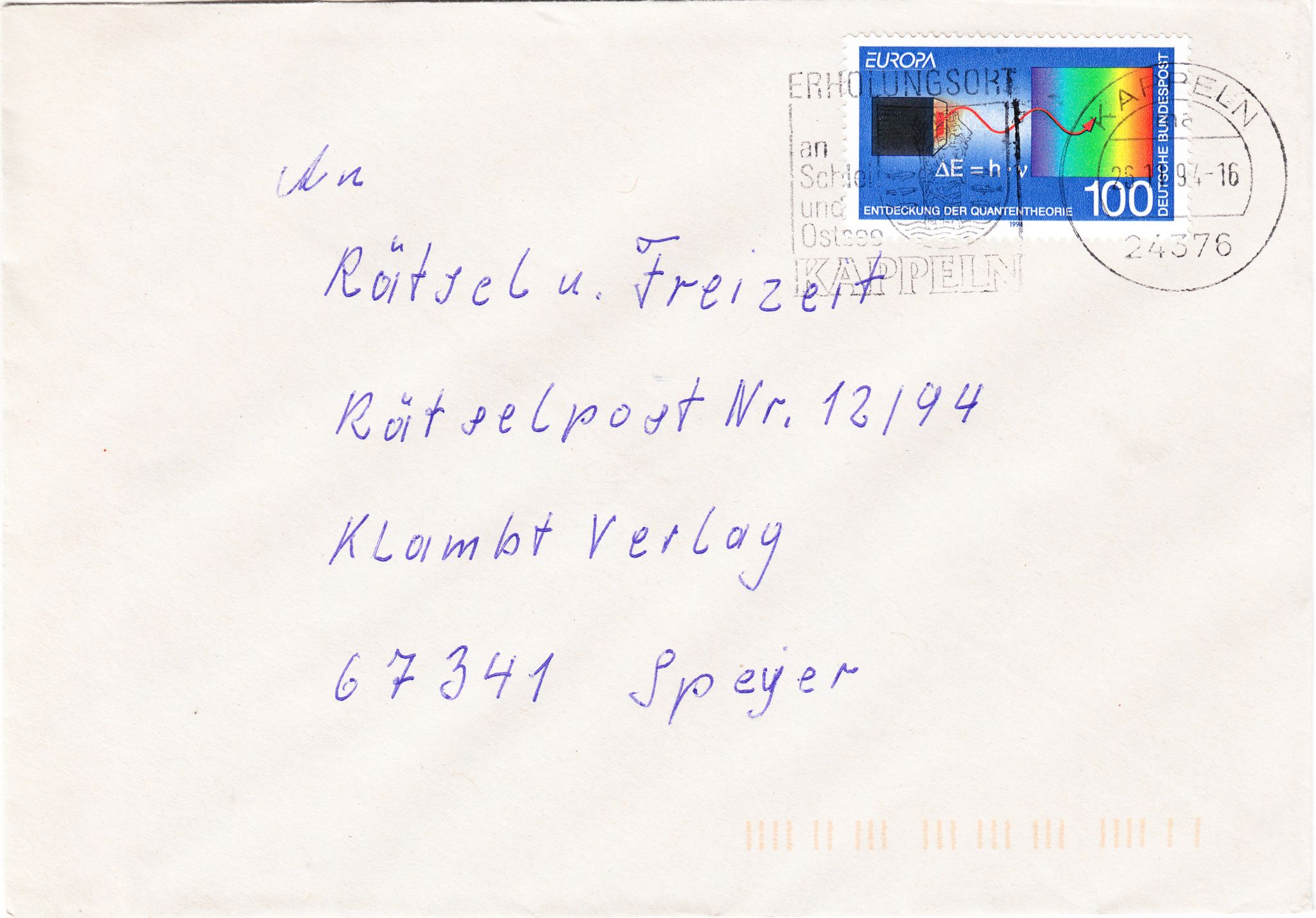 Hier wurde eine Europamarke 1994 in der Wertstufe zu 100 Pfennig am 11.11.1994 auf einer Postkarte verklebt, wofür 80 Pfennig ausgereicht hätten: