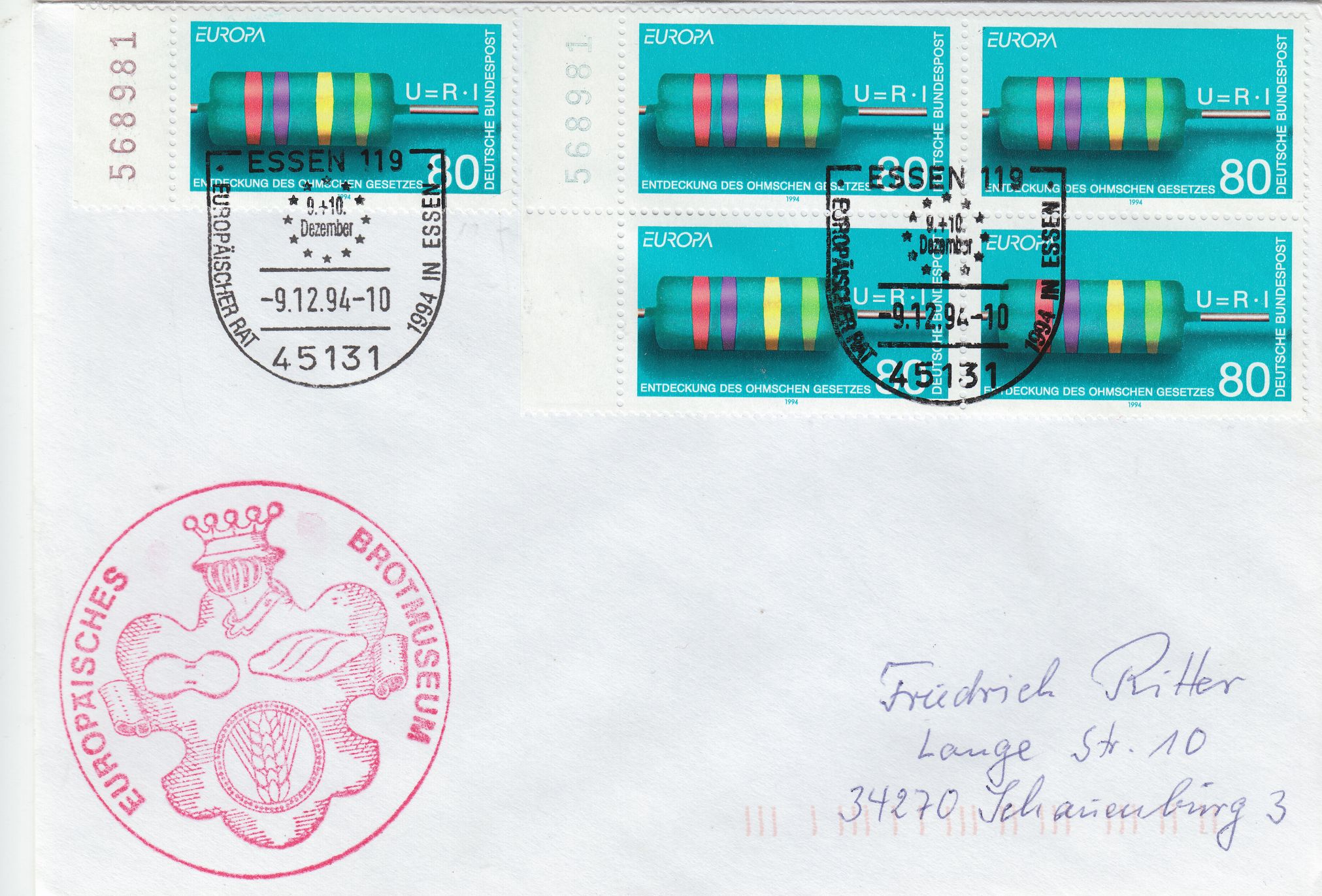 Dieser Beleg wurde am 09.12.1994 frankiert mit einer Einzelmarke vom linken Bogenrand sowie einem Viererblock vom linken Bogenrand, beide mit Bogenzählnummern, aber in zwei verschiedenen Farben:
