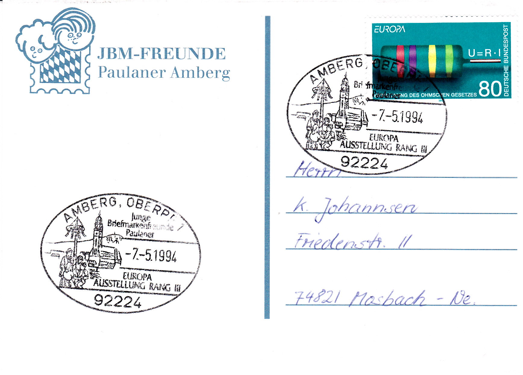 Postkarte mit einer Europamarke 1994 zu 80 Pfenning, die am 7.5.1994, also zwei Tage nach Ausgabe, mit einem thematisch passenden Sonderstempel aus Amberg zu einer Europaausstellung im Rang 3 der Jungen Briefmarkenfreunde Amberg gestempelt wurde. Die Ausstellung wurde in Zusammenarbeit mit der Europa-Union am 7./8. Mai 1993 im Gregor-Mendel-Gymnasium durchgeführt.
