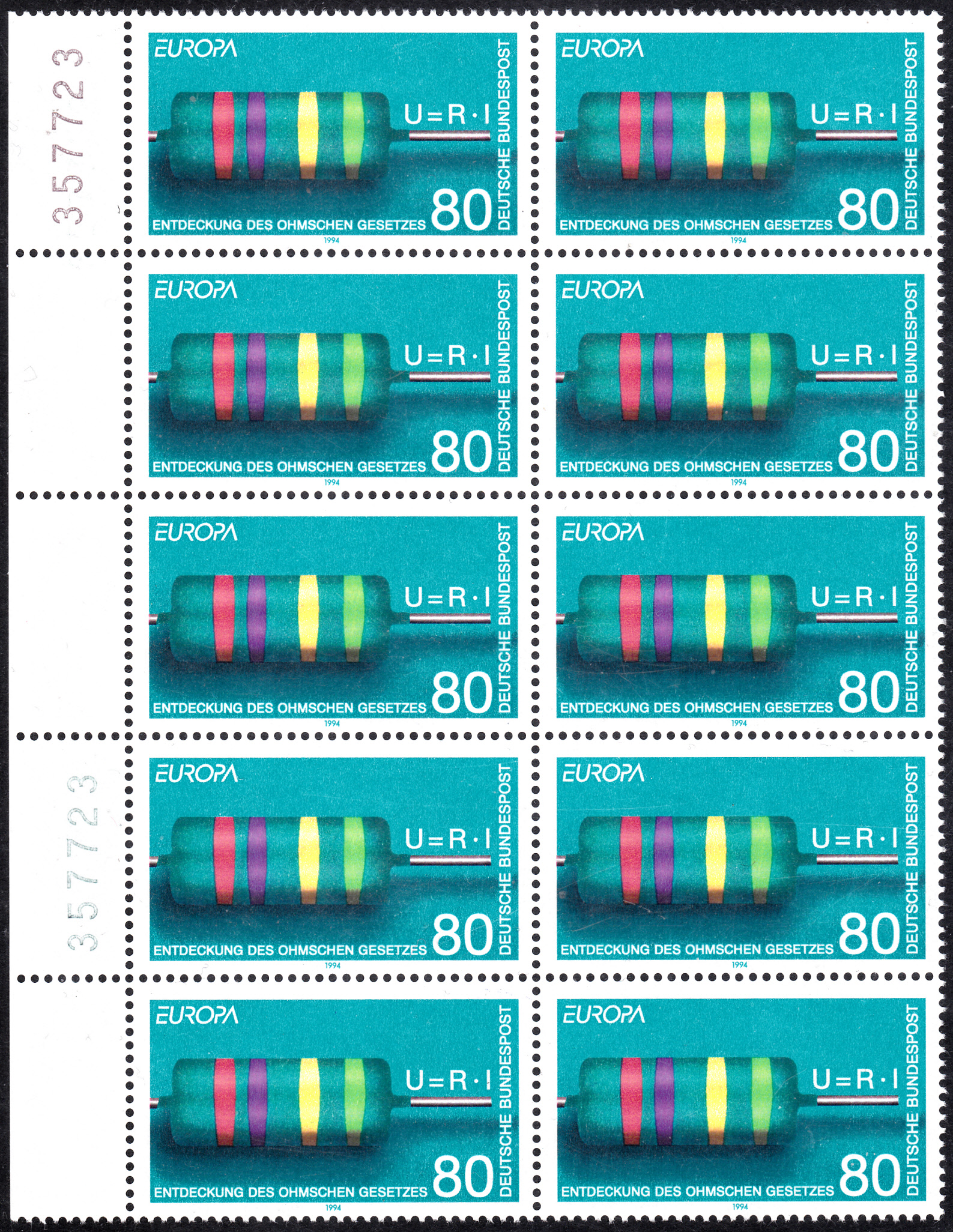 Zehnerblock vom linken Bogenrand mit Bogenzählnummer in zwei Farben auf dem Bogenrand.
