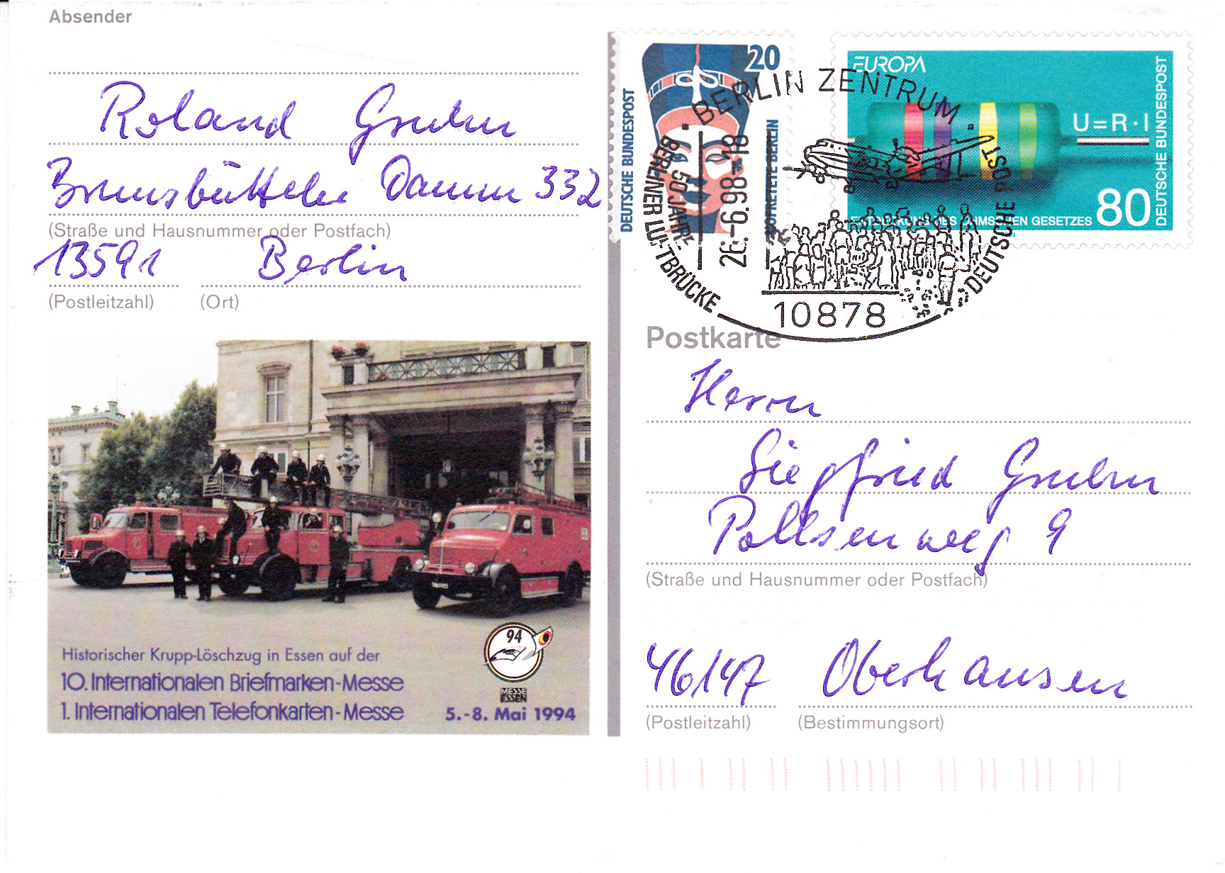 Zur Briefmarkenmesse in Essen erschien eine Sonderpostkarte (MiNr PSo 33) mit dem Wertzeicheneindruck der Europamarke 1994.