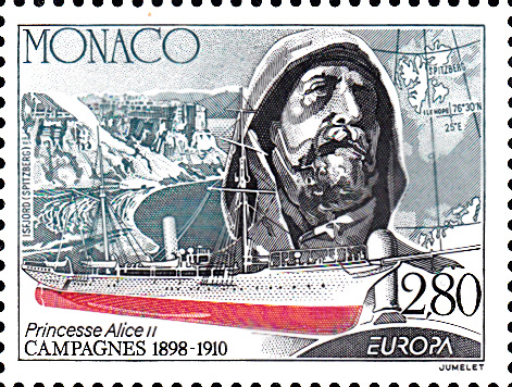 In Monaco erschienen die Europamarken 1994 zum Gemeinschaftsthema "Entdeckungen und Erfindungen" am 4. Mai 1994 mit Abbildungen zu den Forschungsreisen von Fürst Albert I. (1848-1922). Hier der Wert zu 2,80 Francs mit dem Kopf des Fürst-Albert-I.-Denkmals in Monaco-Ville, dem Forschungsschiff „Princesse Alice II“, einer Ansicht von Monaco und einer Karte von Spitzbergen.