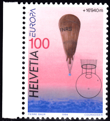 In der Schweiz erschienen die Europamarken 1994 zum Gemeinschaftsthema "Entdeckungen und Erfindungen" am 17. Mai 1994. Hier der Wert zu 100 Rappen mit einer Darstellung zum ersten bemannten Stratosphärenflug durch Auguste Piccard (1884–1962, Physiker). Im Markenbild wird der Stratosphärenballon "FNRS" gezeigt. Die Marke erschien in einer Auflage von 5.610.000 Stück.