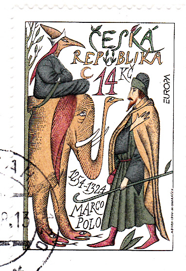 In der Tschechischen Republik erschienen die Europamarken 1994 zum Gemeinschaftsthema "Entdeckungen und Erfindungen" am 4. Mai 1994 mit phantastische Illustrationen von Adolf Born (*1930) zum Thema "Die Reise von Marco Polo". Hier einer der beiden Werte zu 14 Kronen. Die Marke wurde mit der zweiten Marke zu ebenfalls 14 Kronen schachbrettartig zusammenhängend im Kleinbogen zu 4 Marken gedruckt. Die Auflage betrug 562 000 Sätze.
