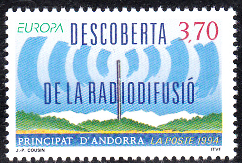 In Andorra erschienen bei der französischen Post die Europamarken 1994 zum Gemeinschaftsthema "Entdeckungen und Erfindungen" am 7. Mai 1994. Hier der Wert zu 3,70 Francs mit einer Darstellung zur Entdeckung der Radiowellen. Die Auflage dieser Marke betrug 190 668 Stück.
