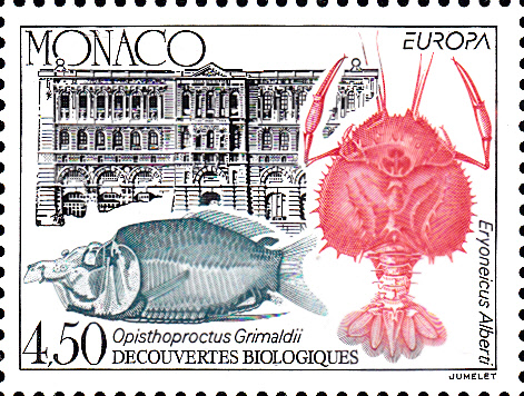In Monaco erschienen die Europamarken 1994 zum Gemeinschaftsthema "Entdeckungen und Erfindungen" am 4. Mai 1994 mit Abbildungen zu den Forschungsreisen von Fürst Albert I. (1848-1922). Hier der Wert zu 4,50 Francs mit dem Ozeanographisches Museum in Monaco-Ville und von Fürst Albert I. entdeckte Tiefseetiere Opisthoproctus grimaldii und Eryoneicus alberti.