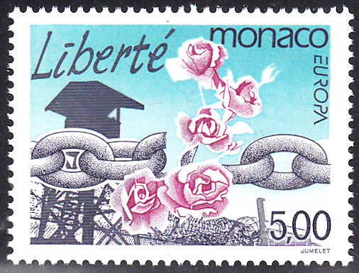 In Monaco erschienen die Europamarken 1995 am 8. Mai 1995 zum Gemeinschaftsthema "Frieden und Freiheit". Hier die Marke zu 5,00 Francs mit der Abbildung eines Wachturmes eines Gefangenenlagers, einer zerbrochenen Kette und Rosen.
