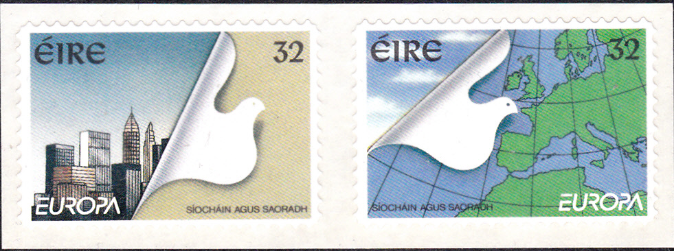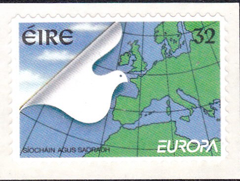 In Irland erschienen die Europamarken 1995 am 6. April 1995 zum Gemeinschaftsthema "Frieden und Freiheit". Die Marken gab es auch selbstklebend und gestanzt aus Rollen. Hier eine der Marken zu 32 Pence mit der Abbildung einer Friedenstaube vor der Landkarte von Europa.