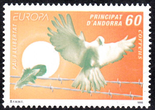 Bei der spanischen Post in Andorra erschiene eine Europamarke 1995 am 8. Mai 1995 zum Gemeinschaftsthema "Frieden und Freiheit". Hier die Marke zu 60 Peseten mit der Abbildung einer Friedenstaube und Stacheldraht. Die Auflage der Marke betrug 650 000 Stück.