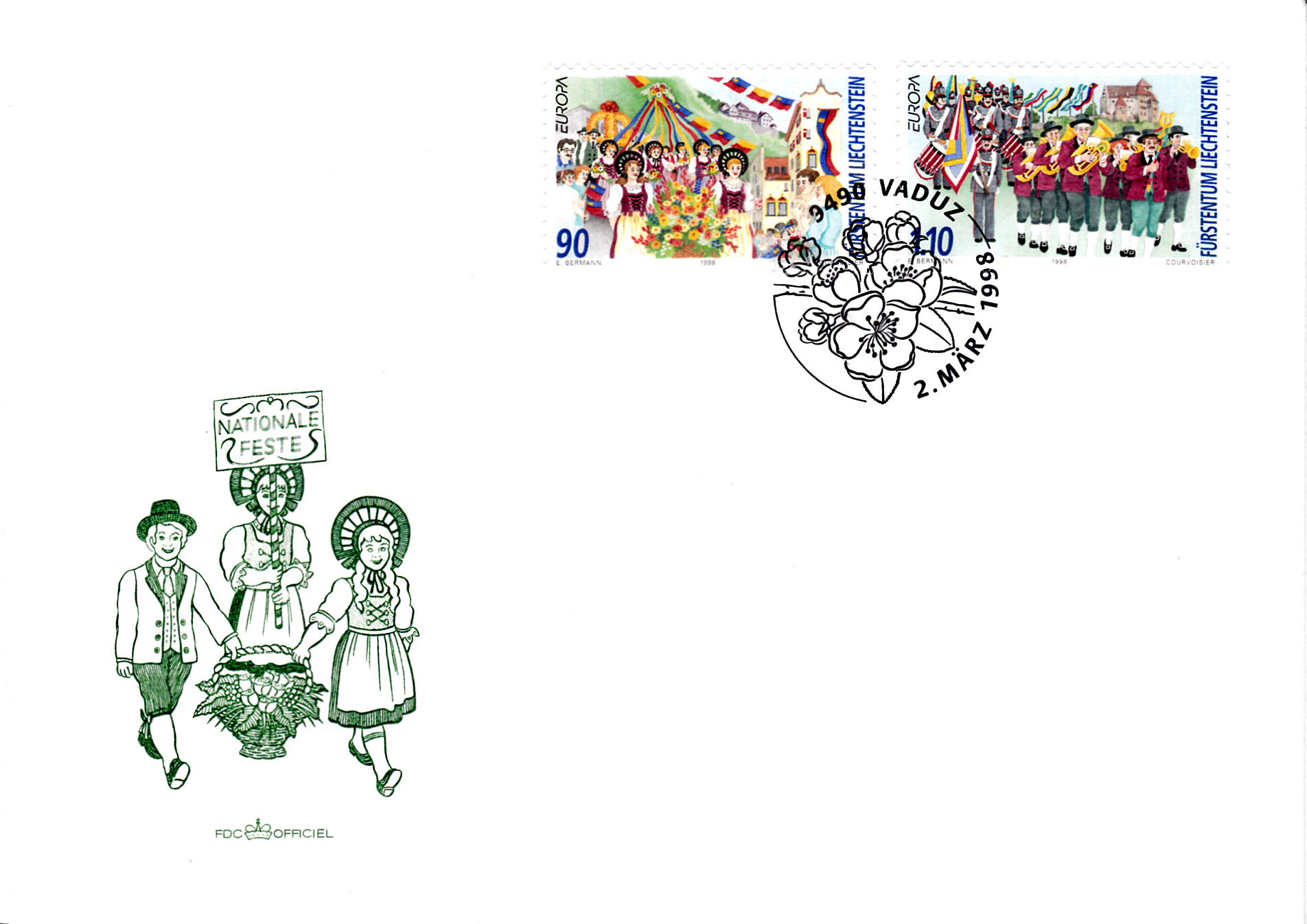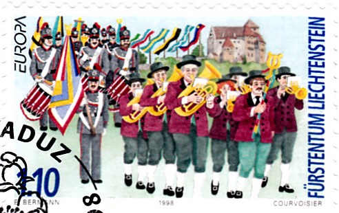 In Liechtenstein erschienen die Europamarken 1998 am 2. März 1998 zum Gemeinschaftsthema "Nationale Feste und Feiertage". Hier eine der Marken zu 1,10Fr mit einer Darstellung zum Verbandsmusikfest. Die Auflage betrug 554 000 Stück.