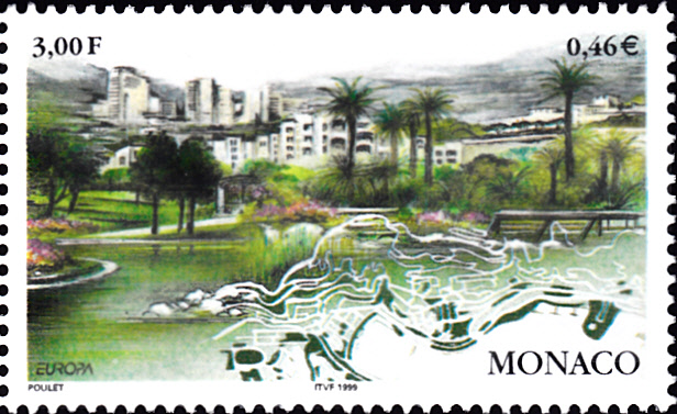 In Monaco erschienen die Europamarken 1999 zum Gemeinschaftsthema "National- und Naturparks" am 5. Mai 1999. Hier eine Marke zu 3,00 Fr / 0,46 € mit einer Abbildung aus dem Park von Fontvieille.