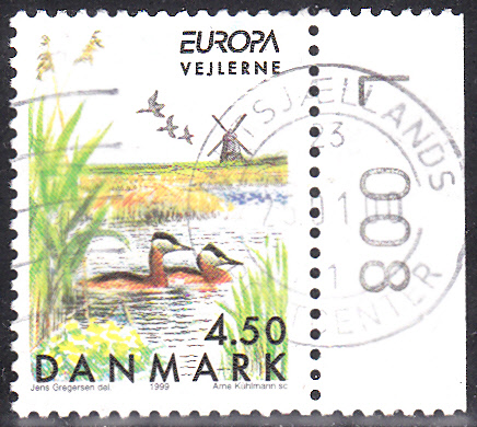 In Dänemarke erschienen die Europamarken 1999 zum Gemeinschaftsthema "National- und Naturparks" am 28. April 1999. Hier eine gestempelte Marke zu 4,50 Kronen vom Bogenrand mit einer Abbildung aus dem Vogelschutzgebiet Vejlerne. Die Marke erschien in einer Auflage von 6 300 000 Stück.