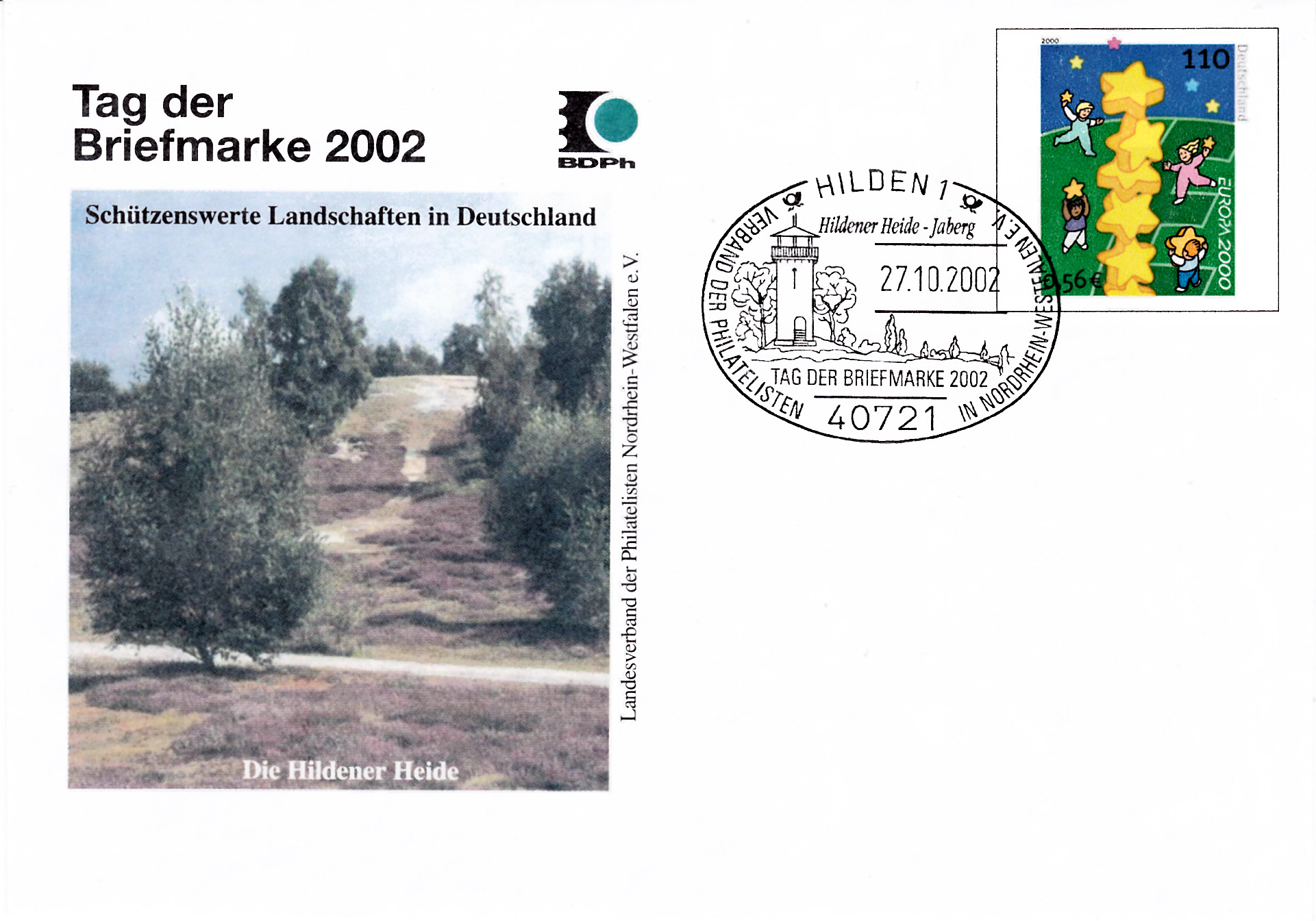 Plusbrief (MiNr USo 20 I) mit dem Wertstempel Europa 2000 (MiNr 2113) und mit einem Zudruck zum Tag der Briefmarke 2002 und dem Sonderstempel zum Tag der Briefmarke 2002 aus Hilden.