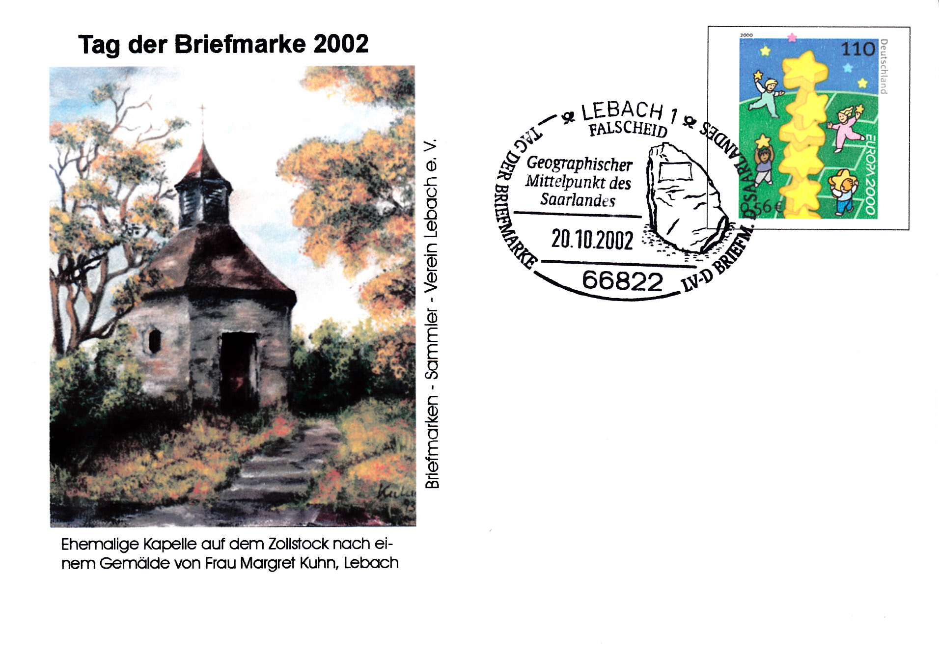 Plusbrief (MiNr USo 20 I) mit dem Wertstempel Europa 2000 (MiNr 2113) und mit einem Zudruck zum Tag der Briefmarke 2002 und dem Sonderstempel zum Tag der Briefmarke 2002 aus Lebach.