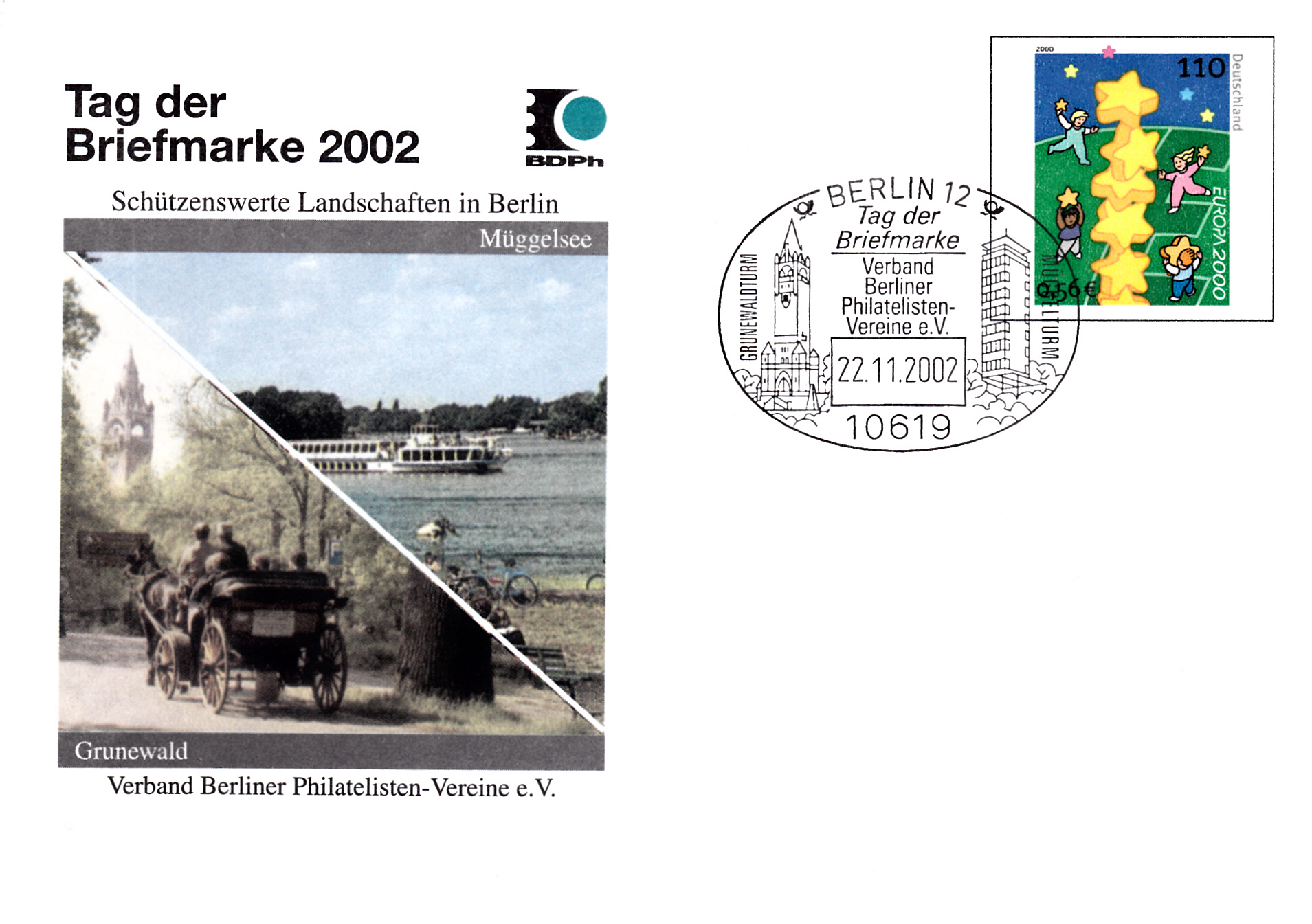 Plusbrief (MiNr USo 20 II) mit dem Wertstempel Europa 2000 (MiNr 2113) und mit einem Zudruck zum Tag der Briefmarke 2002 und dem Sonderstempel zum Tag der Briefmarke 2002 aus Berlin.