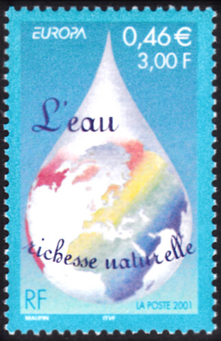 In Frankreich erschien die Europamarke 2001 am 8.Mai 2001 zum Gemeinschaftsthema "Lebensspender Wasser". Die Marke zu 3,00 Fr / 0,46 € hat das Markenbild "Erdkugel in Wassertropfen". Die Auflage betrug 12 414 392 Stück.