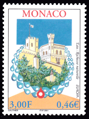 In Monaco erschienen die Europamarken 2001 zum Gemeinschaftsthema "Lebensspender Wasser" am 7. Mai 2001. Diese Marke zu 3,00 Fr / 0,46 € zeigt den Fürstenpalast und Wassertropfen.