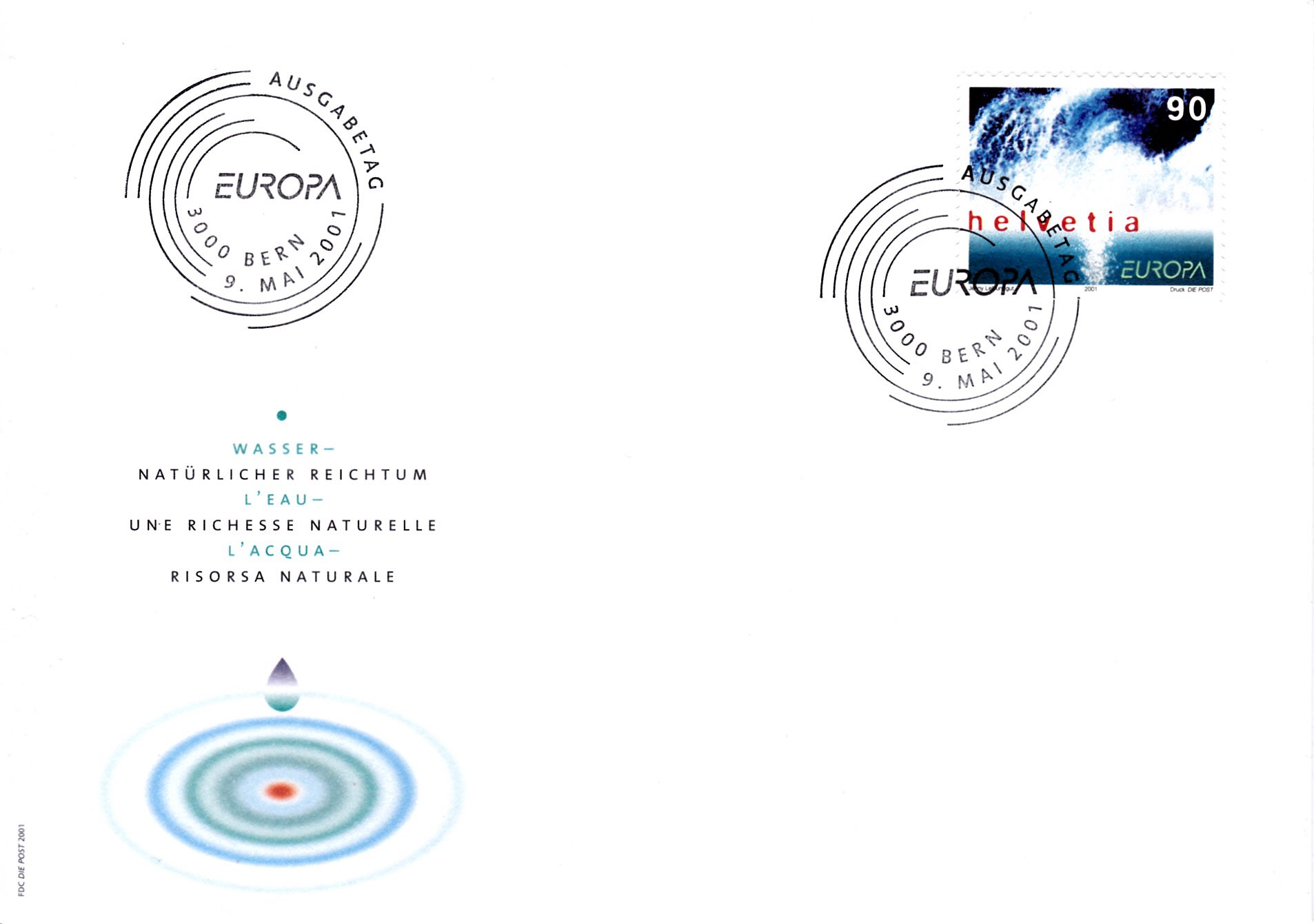 In der Schweiz erschien die Europamarke 2001 am 9. Mai 2001 zum Gemeinschaftsthema "Lebensspender Wasser". Die Marke zu 90 Rappen zeigt im Markenbild Wasserfontänen. Die Auflage betrug 4 400 000 Stück.