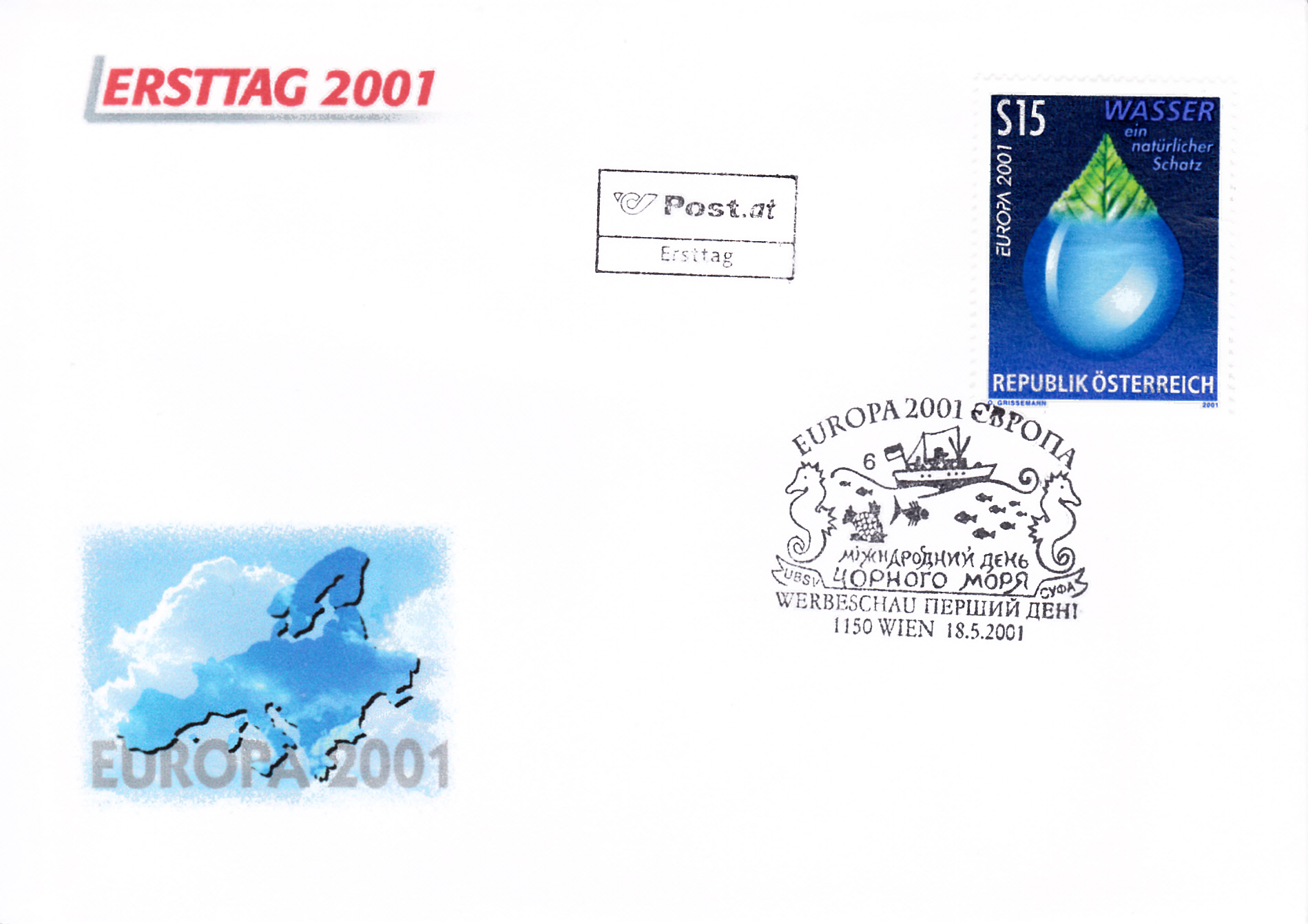 In Österreich erschien die Europamarke 2001 am 18. Mai 2001 zum Gemeinschaftsthema "Lebensspender Wasser". Die Marke zu15 Schilling zeigt die Darstellung "Blatt erwächst aus Wassertropfen". Die Auflage betrug 1 500 000 Stück.