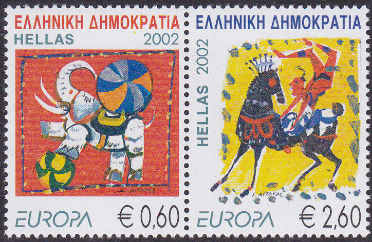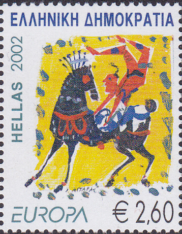 Die Europamarken 2002 zum Thema "Zirkus" erschienen in Griechenland am 9. Mai 2002. Hier die Marke zu 2,60 € aus dem Bogen (MiNr 2111 A, vierseitig gez. K 13 1/4:13 3/4) mit der Abbildung eines Kunstreiters. Die Auflage dieser Marke beträgt 504 004 Stück.