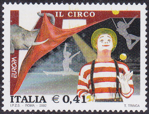 Eine Europamarke 2002 zum Thema "Zirkus" erschien in Italien am 4. Mai 2002. Hier die Marke zu 0,41 € mit einem Jonglierenden Clown, einer Seiltänzerin, einerArtistin am Trapez und einem Elefanten. Die Auflage dieser Marke beträgt 3 500 000 Stück.