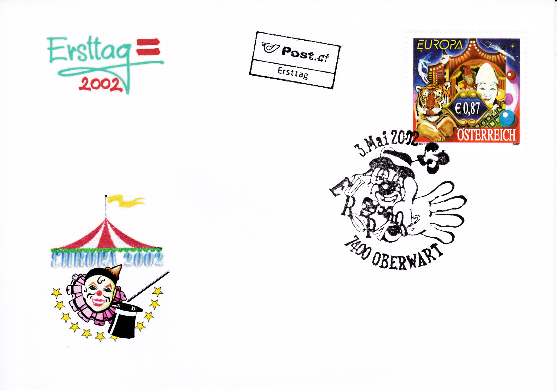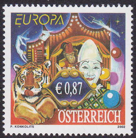 In Österreich erschien eine Europamarke 2002 zum Thema "Zirkus" am 3. Mai 2002. Hier die Marke zu 0,87 € mit einem Weißclown mit maskiertem Affen, einem Tiger und Artisten am Trapez. Die Auflage dieser Marke beträgt 420 000 Stück.