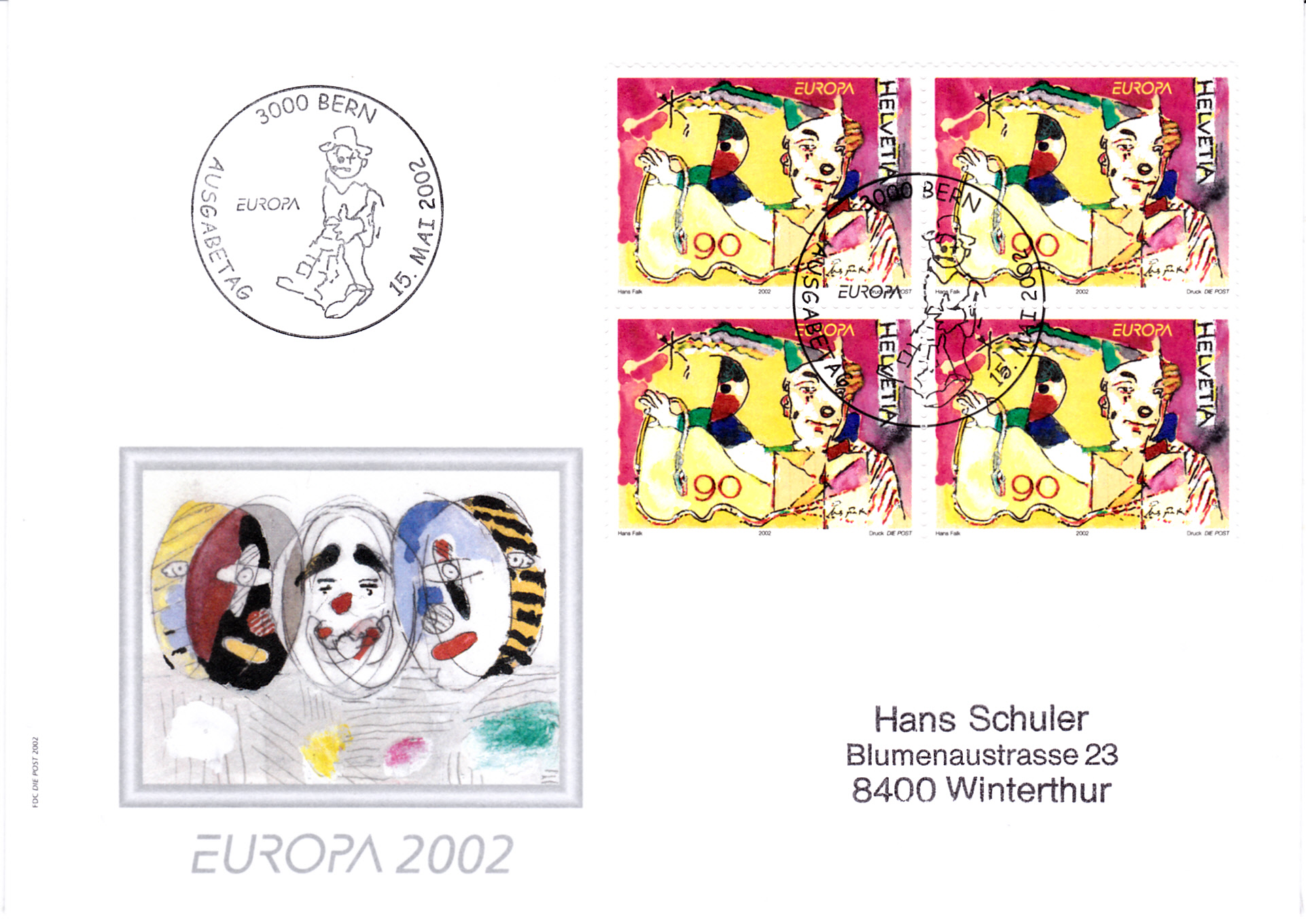 Die Europamarken 2002 zum Thema "Zirkus" erschienen in der Schweiz am 15. Mai 2002. Hier zeige ich die Marke zu 90 Rappen mit der Abbildung eines Clowns nach einem Gemälde von Hans Falk (1918-2002, Zeichner und Maler) als Viererblock auf einem FDC. Die Auflage dieser Marke beträgt 3 500 000 Stück.