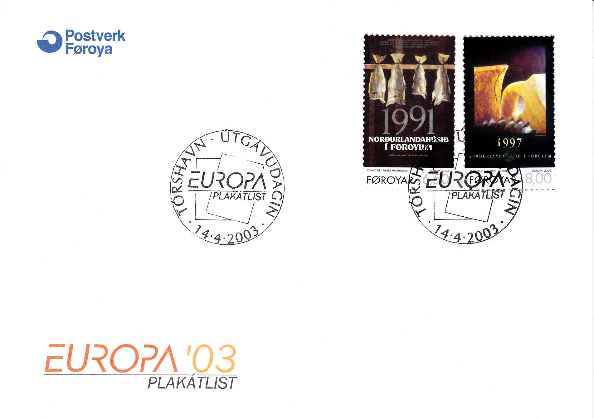In Dänemark Färöer erschienen die Europamarken 1993 zum Gemeinschaftsthema "Plakatkunst" am 14. April 1993. Hier zeige ich die Marke zu 8,00 Kronen mit einem Werbeplakat für das Haus des Nordens in Tórshavn (1997) von Guðrið