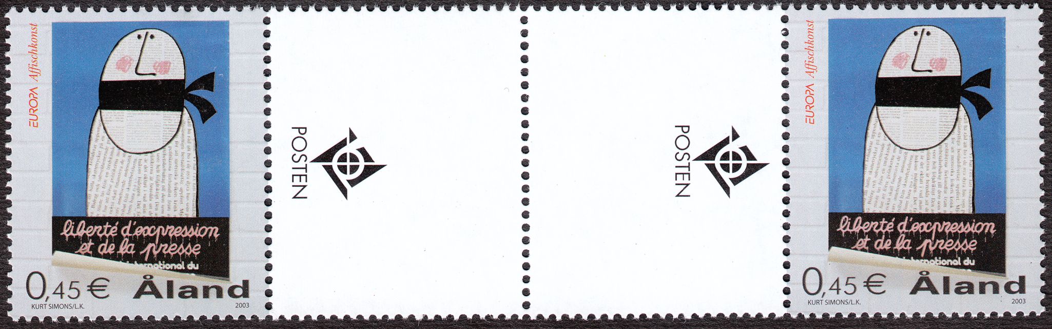 Zum Thema "Plakatkunst" erschien in Åland 2003 in einer Auflage von 400.000 Stück diese Europamarke in der Wertstufe zu 0,45 €, hier als postfrisches waagerechtes Zwischenstegpaar:
