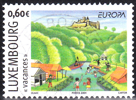 In Luxemburg erschienen die Europamarken 2004 zum Gemeinschaftsthema "Ferien" am 9. Mai 2004. Hier die Marke zu 60 Cent mit dem Campingplatz, dem Flussbad und dem Schloss in Bourscheid-Plage. Die Auflage der Marke betrug 600 000 Stück.