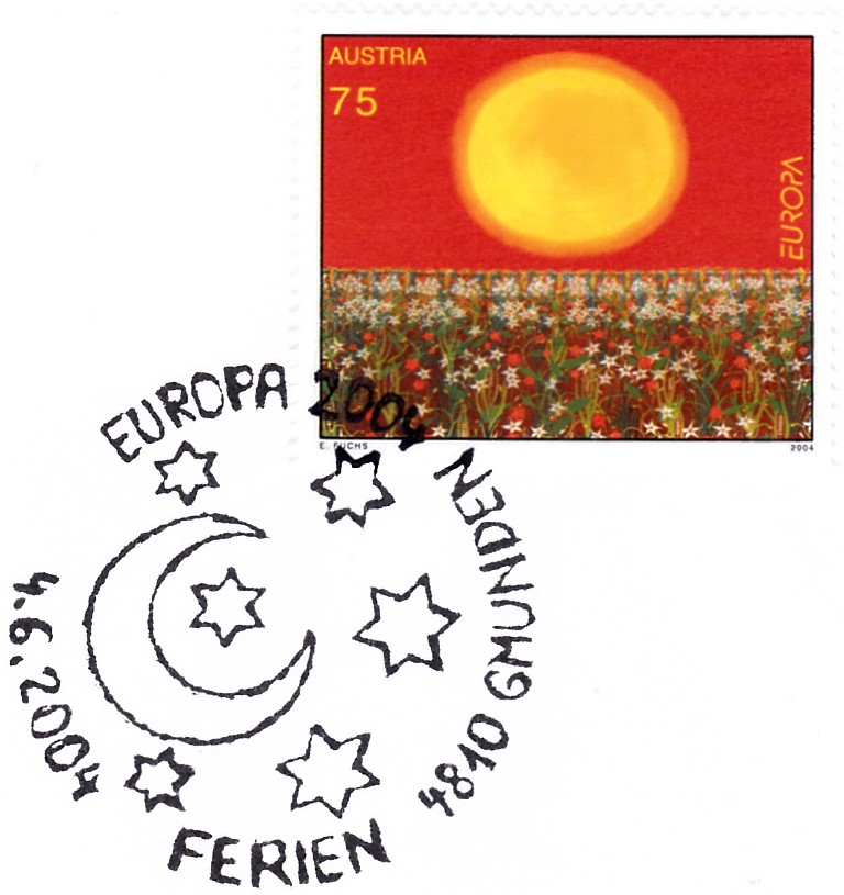 In Österreich erschien eíne Europamarke 2004 zum Gemeinschaftsthema "Ferien" am 4. Juni 2004. Hier die Marke zu 75 Cent mit einer Sonne über einem Blumenfeld. Die Auflage der Marke betrug 600 000 Stück.
