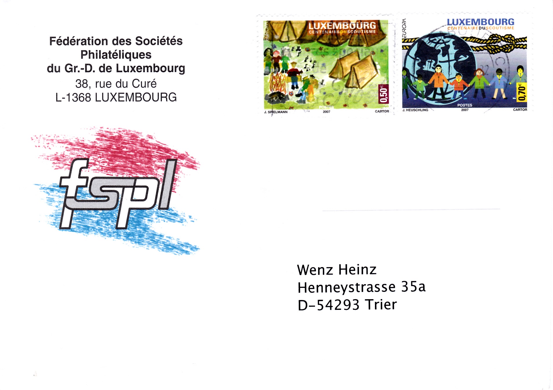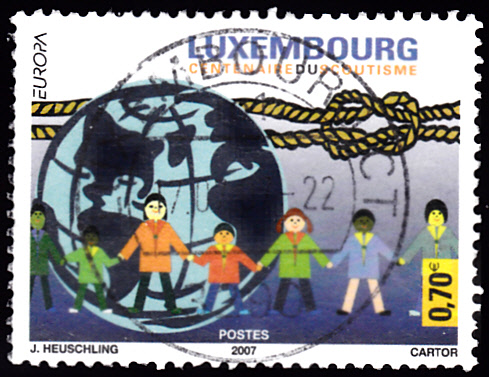 In Luxemburg erschienen am 4. Mai 2007 die Europamarken zum Gemeinschaftsthema "Pfadfinder". Hier eine gestempeltes Exemplar der Marke zu 0,70 € mit der Abbildung von Pfadfinder verschiedener Länder, einer Weltkugel und einem Weberknoten. Die Auflage dieser Marke betrug 225 000 Stück.