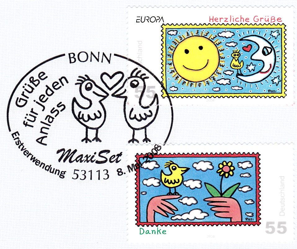 Zu den vier selbstklebenden Marken aus dem Markenheftchen wurde am Ausgabetag des Heftchen auch ein Erstverwendungsstempel in Bonn eingesetzt.