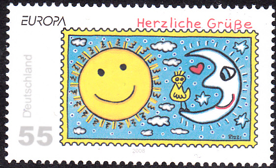 Bei der Deutschen Post erschien die Europamarke 2008 zum Gemeinschaftsthema "Der Brief" am 8. Mai 2008. Hier die Marke zu 55 Cent mit der Abbildung "Herzliche Grüße" . Die Marke hatte eine Auflage von 18 400 000 Stück.