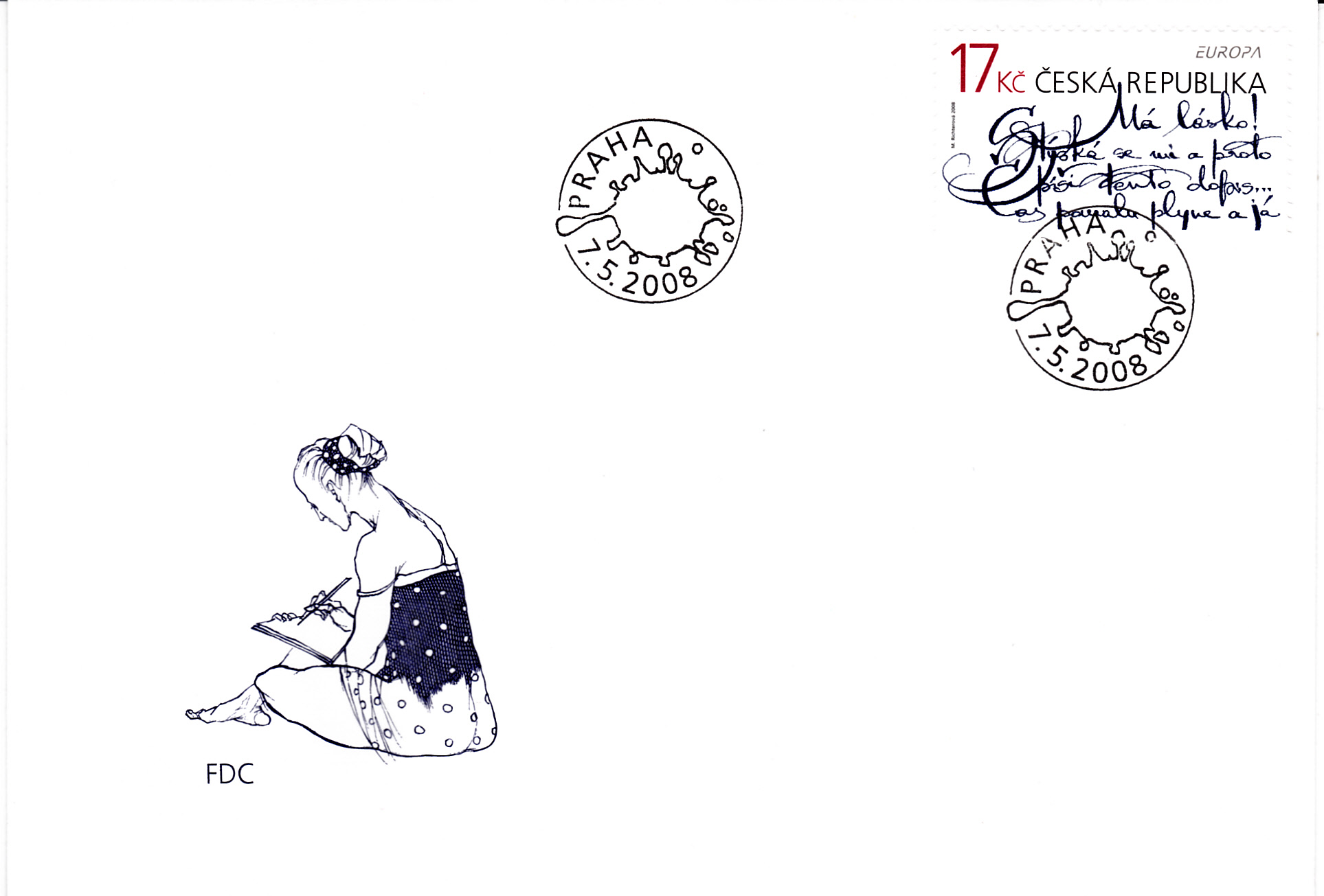 In der Tschechischen Republik erschien die Europamarke 2008 zum Gemeinschaftsthema "Der Brief" am 7. Mai 2008. Hier die Marke zu 17 Kronen mit der Handschrift: "Meine Liebe! Ich habe Sehnsucht, und darum schreibe ich diesen Brief... Die Zeit fließt langsam, und ich...". Die Marke hatte eine Auflage von 344 000 Stück.