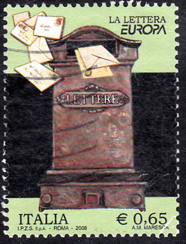 In Italien erschienen die Europamarken 2008 zum Gemeinschaftsthema "Der Brief" am 9. Mai 2008. Hier die Marke zu 0,65€ mit der Abbildung Briefkasten und Briefe. Die Marke hatte eine Auflage von 3 500 000 Stück.