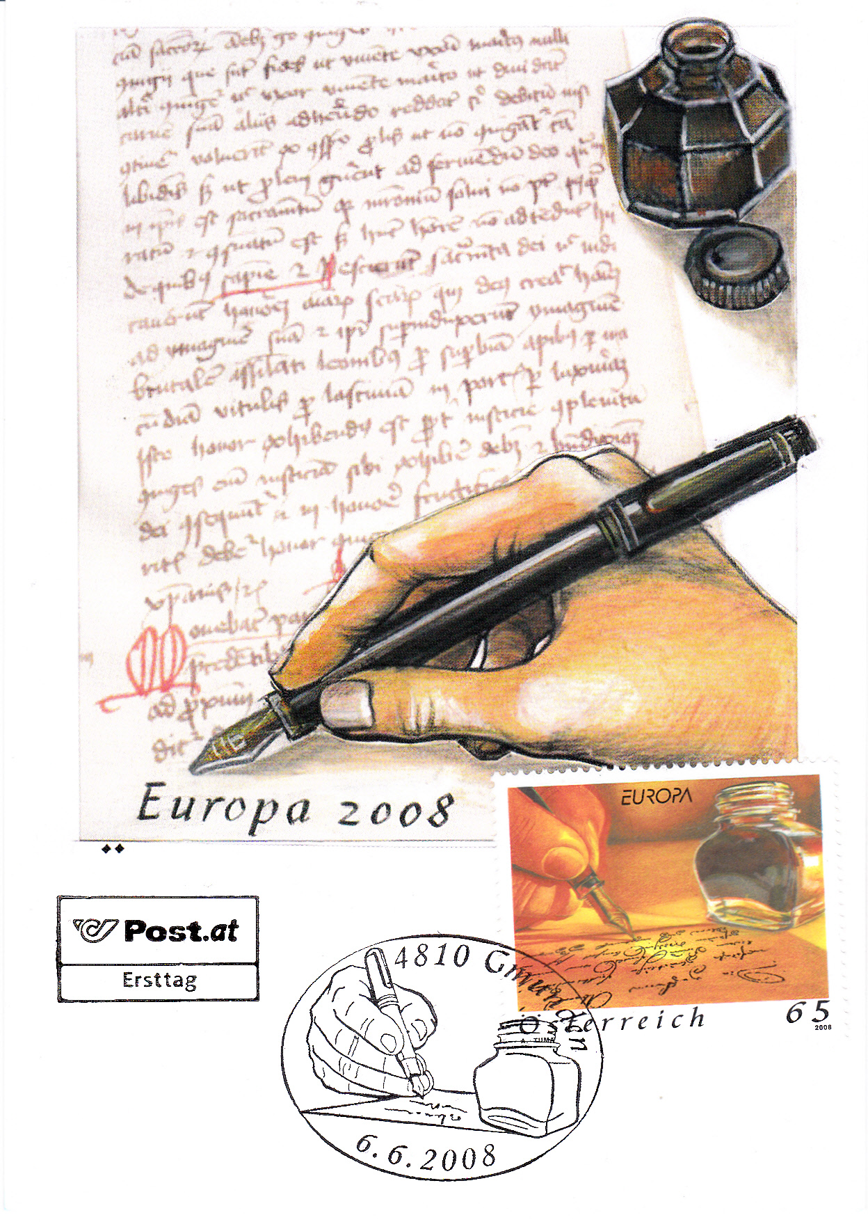 In Österreich erschienen die Europamarken 2008 zum Gemeinschaftsthema "Der Brief" am 6. Juni 2008. Hier die Marke zu 65 Cent mit der Abbildung "Hand mit Schreibfeder, Tintenfass und Brief ". Die Marke hatte eine Auflage von 800 000 Stück.
