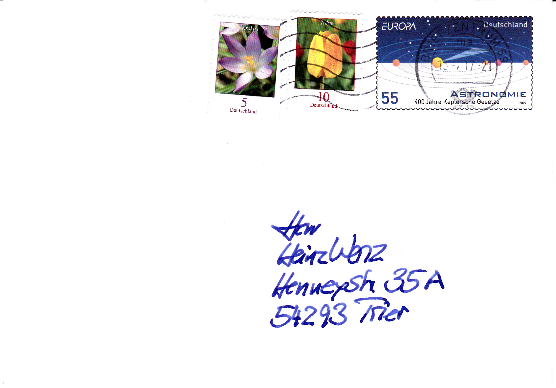 Im Oktober 2010 ist auch ein Plusbrief im Format C6 (MiNr USo 217) mit einem Wertstempel im Muster der Europamarke 2009 "Astronomie: 400 Jahre Keplersche Gesetze" erschienen. Hier ein erst 2017 verwendeter Umschlag mit Zusatzfrankatur.